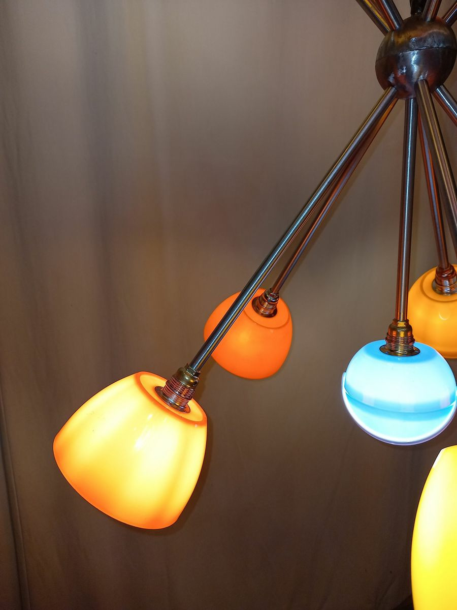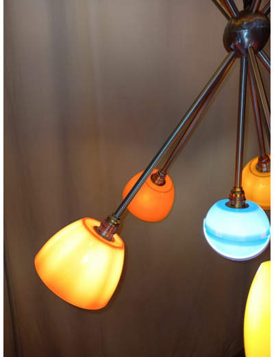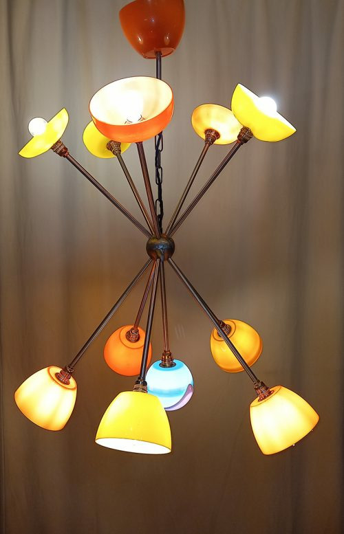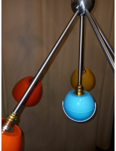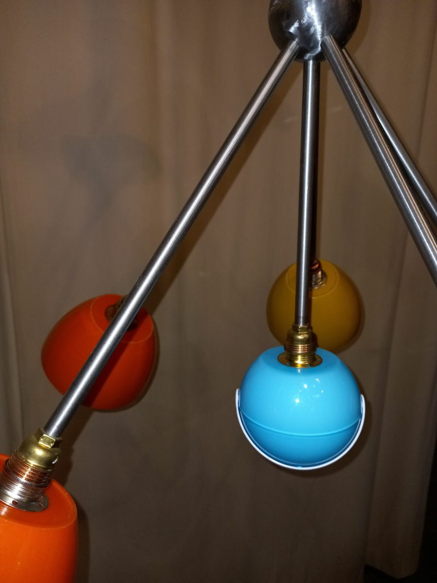 Le lustre Céleste 70’s gs 11 est composé de seau à glaçons « pomme vintage » année 70, d’un sucrier bleu, de tubes inox alu et cuivre, de deux demi-sphères en métal poli, d’un pavillon en inox et de 11 douilles E 14.