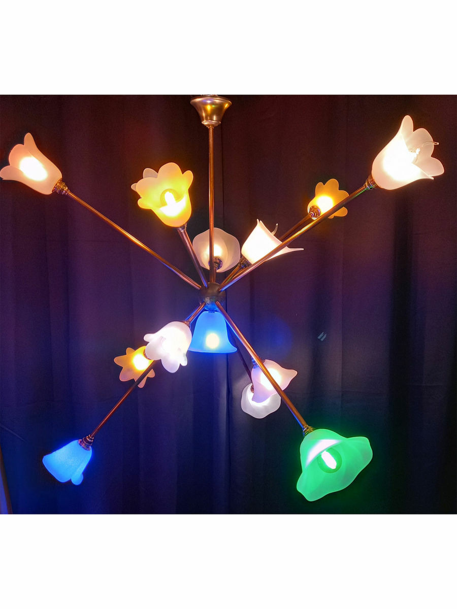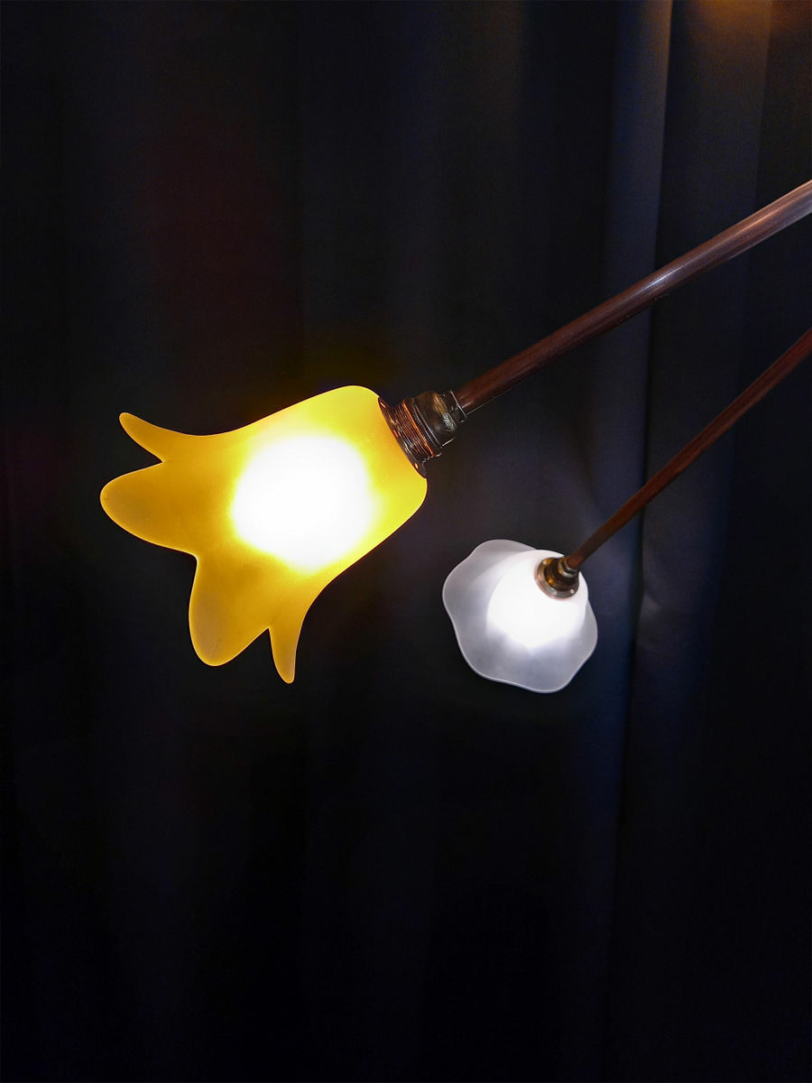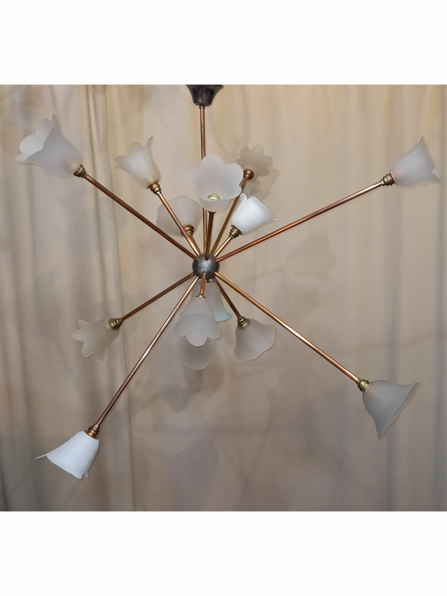Le lustre Tulipia 1 C T 14×14 est composé de tubes en cuivre, de deux demi-sphères en métal poli, d’un pavillon en inox, de tulipes en verre poli, et de 14 ampoules E 14.