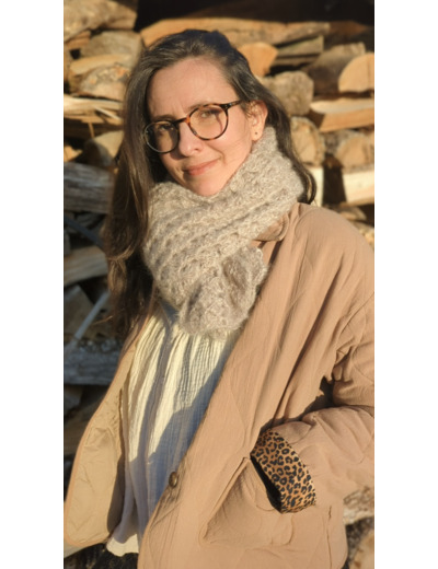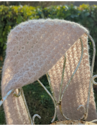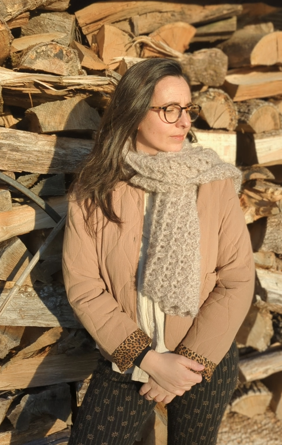 Cette écharpe est entièrement tricotée à la main avec la laine mohair des chèvres angora de la ferme.