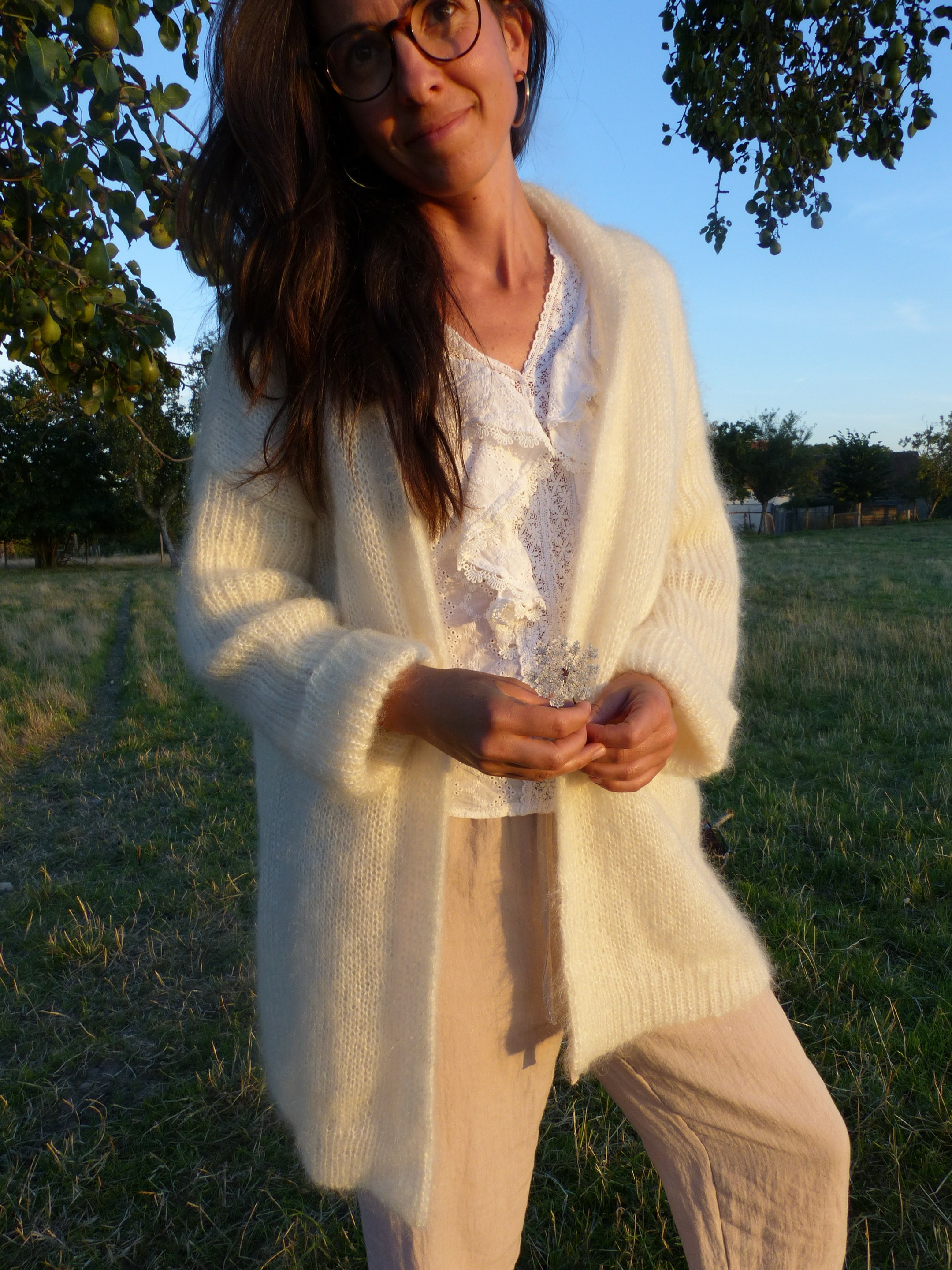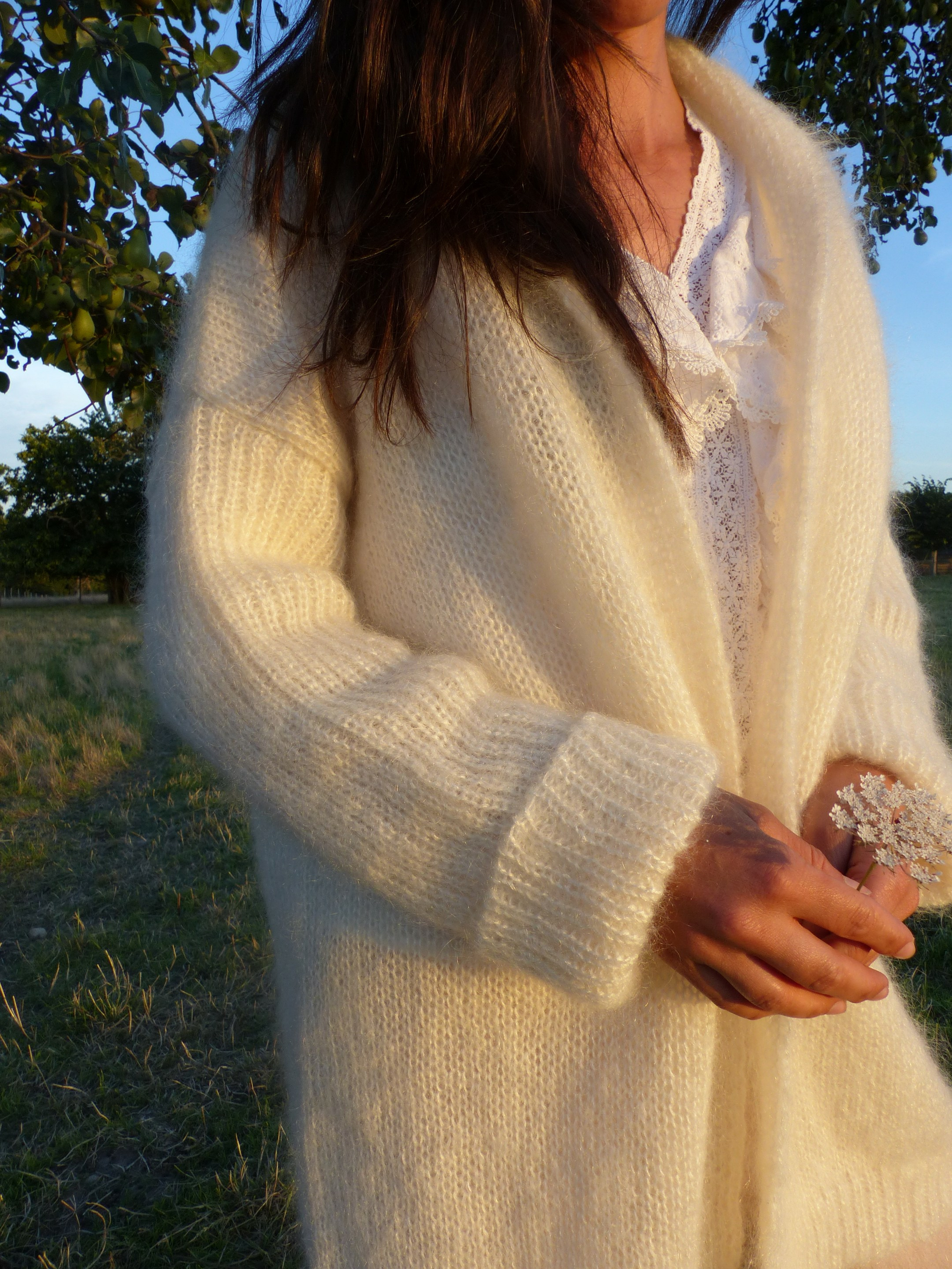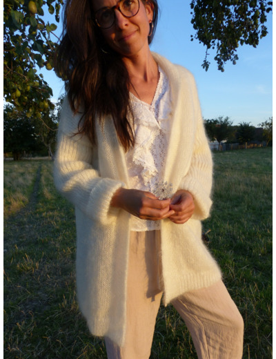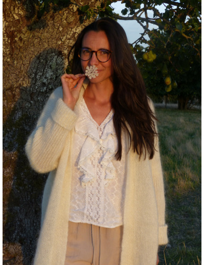 En guise de gilet ou de veste, le gilet TENDRESSE composé de 80% de mohair et de 20% de soie est extrêmement léger, chaud, doux et brillant.
