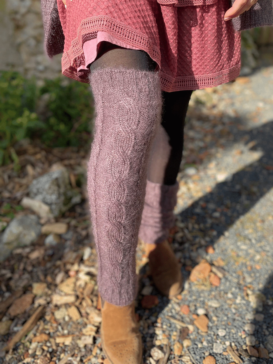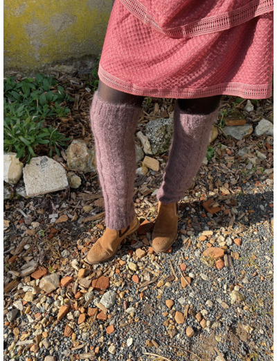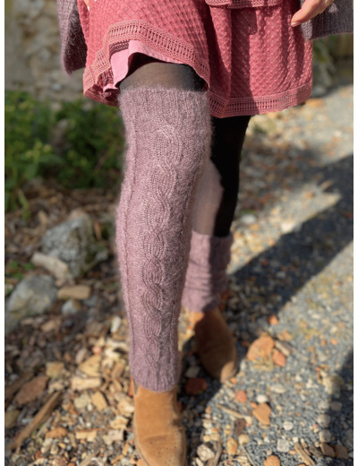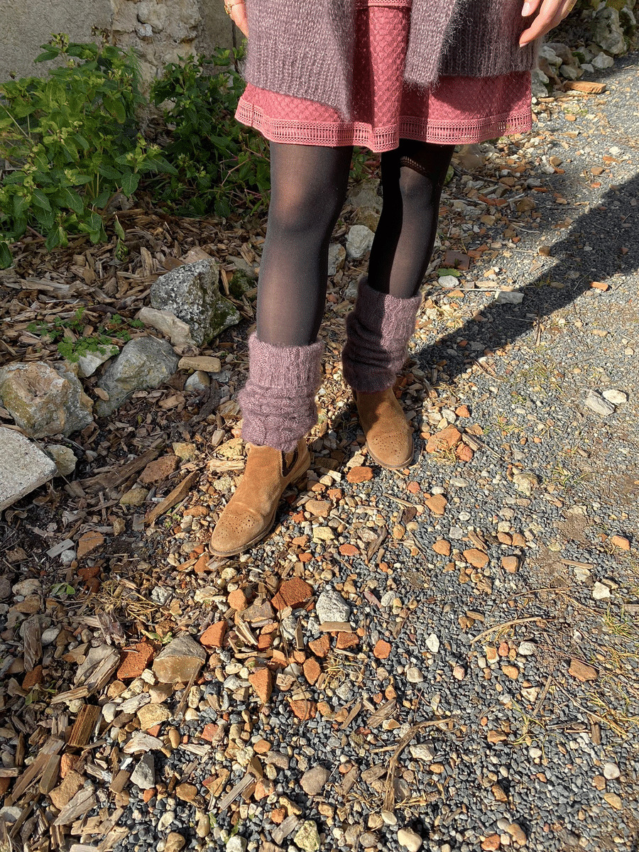 Ces guêtres couleur améthyste se portent aussi bien sur des collants que sur le bas d'un pantalon ou encore dans des bottes.