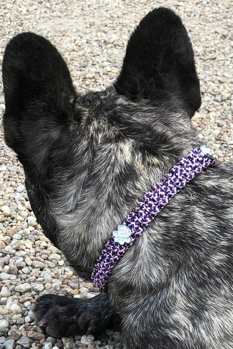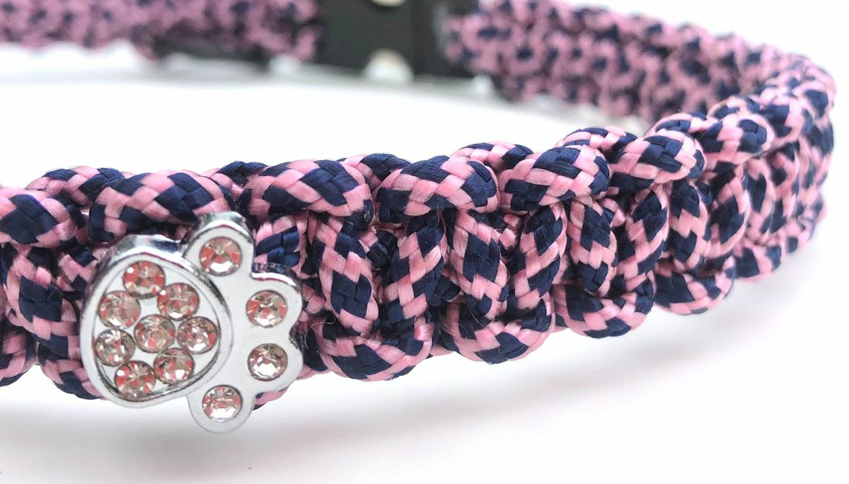 Collier simple tressage non réglable, avec décorations strass en forme de patte, boule d'attache et boucle de fermeture acier et noir.