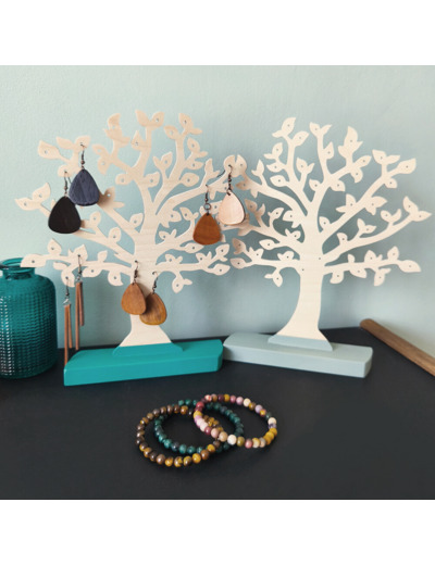 Il peut être utilisé recto verso pour améliorer la visibilité des bijoux. Les boucles d'oreilles peuvent être posées sur des branches ou placées dans les 46 trous percés dans l'arbre.