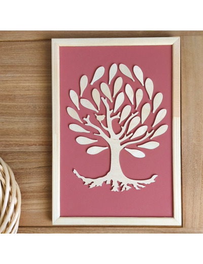 Cadre arbre de vie en bois. Fond de couleur terra cotta et petite mésange sur une branche.