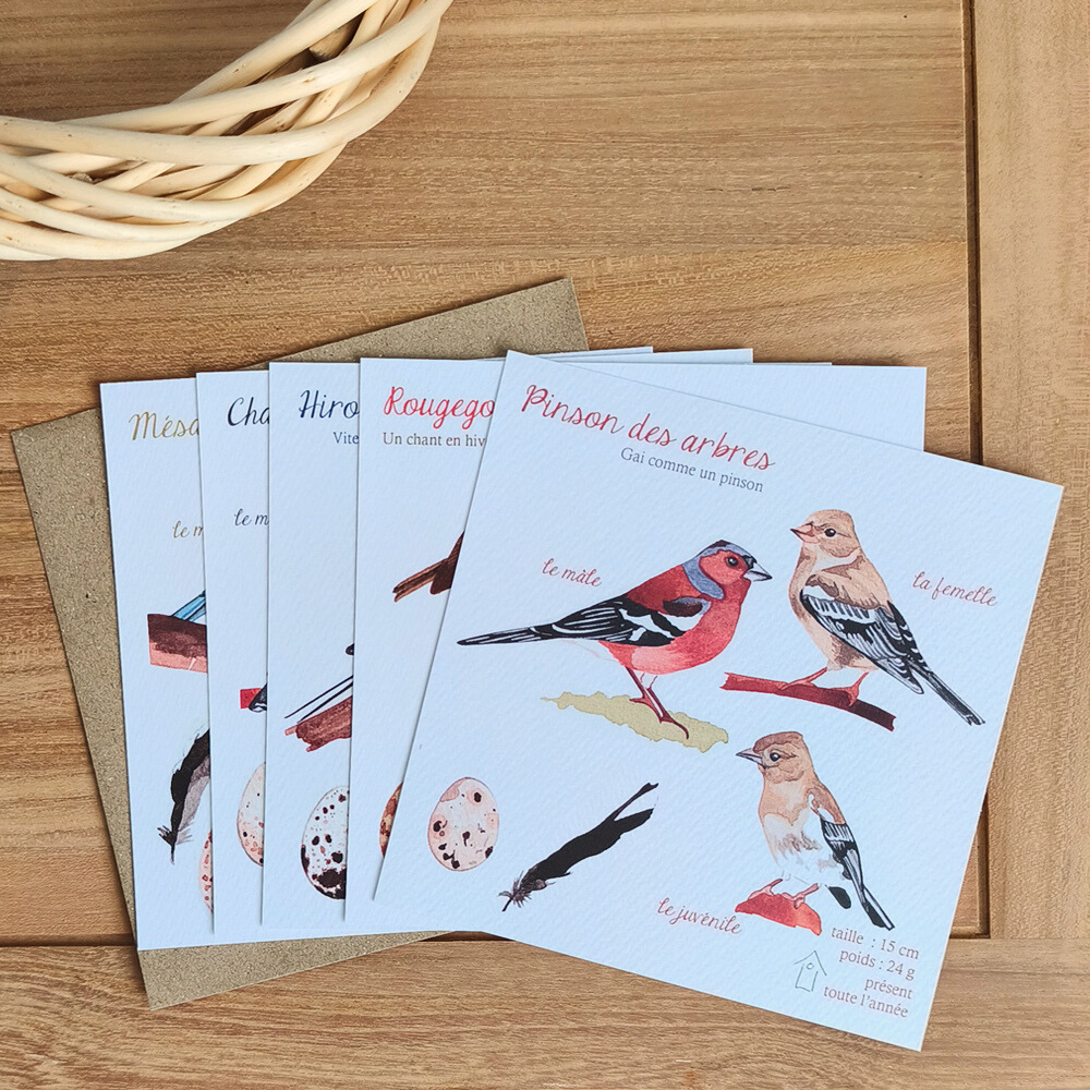 Lot complet des 5 cartes postales : rougegorge, hirondelle, pinson, chardonneret et mésange charbonnière.