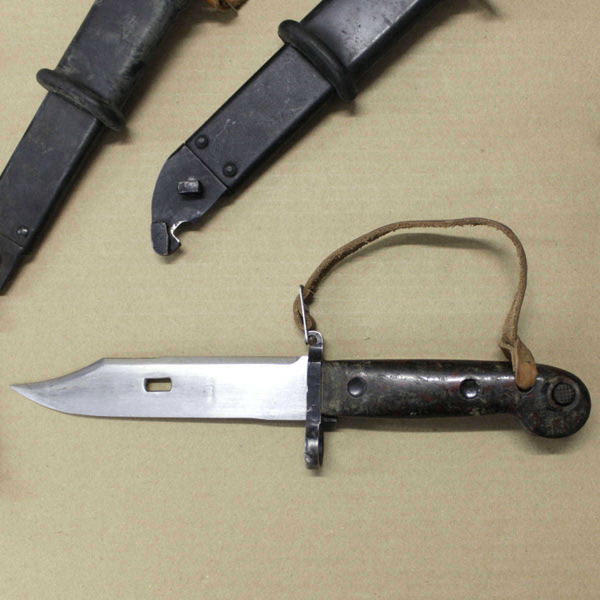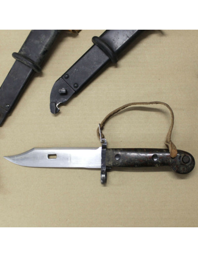 Complète avec fourreau, dragonne en cuir, protection caoutchouc et sangle verrouillage en cuir.