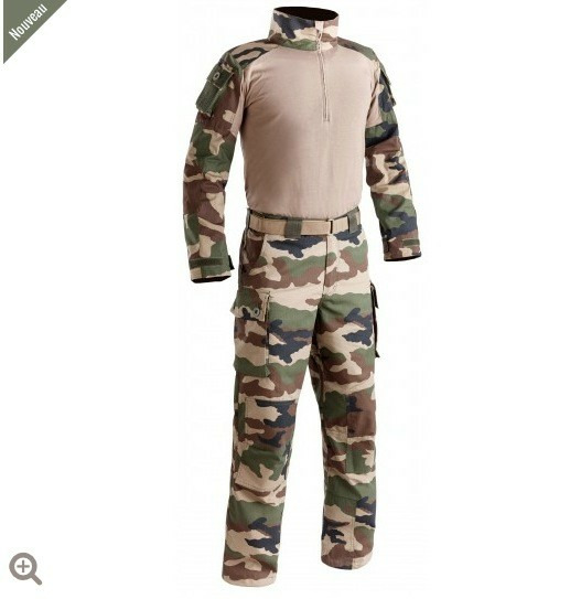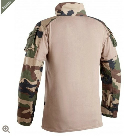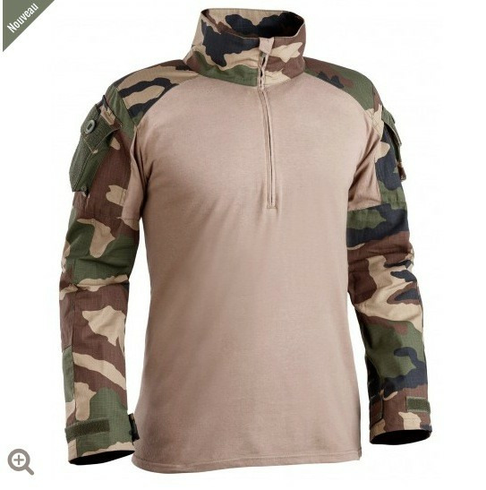La chemise de combat UBAS T.O.E. répond parfaitement aux critères exigés : col avec fermeture par zip, 1 poche sur chaque bras avec bouton et auto-agrippant, œillets d'aération sous les aisselles, renforts sur épaules et aux coudes.