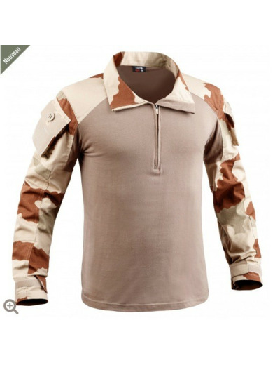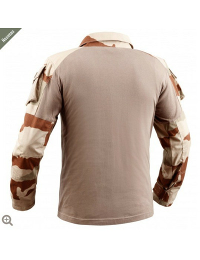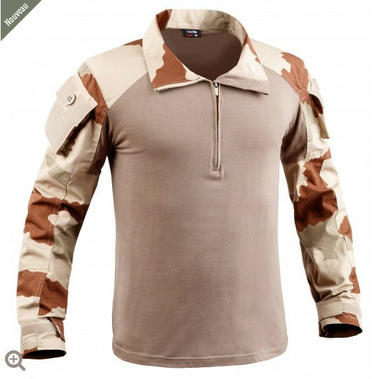 La chemise de combat UBAS T.O.E. répond parfaitement aux critères exigés : col avec fermeture par zip, 1 poche sur chaque bras avec bouton et auto-agrippant, œillets d'aération sous les aisselles, renforts sur épaules et aux coudes.