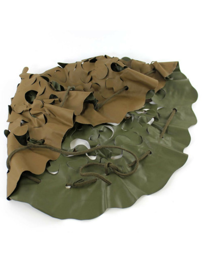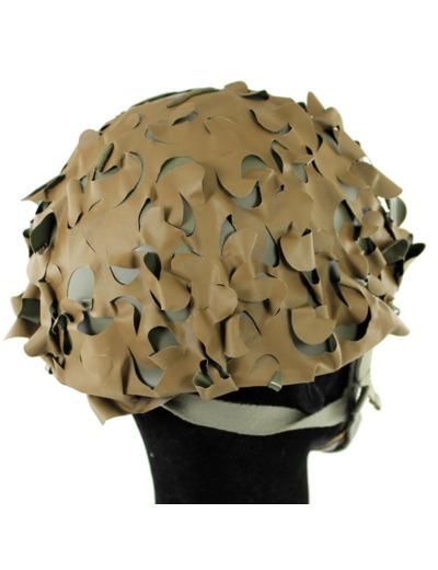 Ce filet de camouflage permet de casser les formes et évite la visibilité du casque lisse sur le terrain. Pour optimiser le camouflage, on peut glisser à travers des découpes du filet branchages, feuilles, mousse.