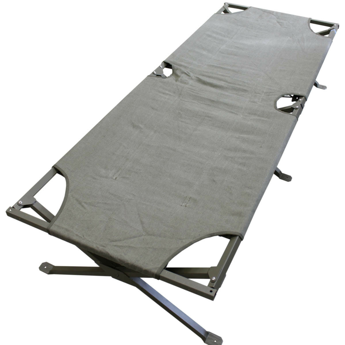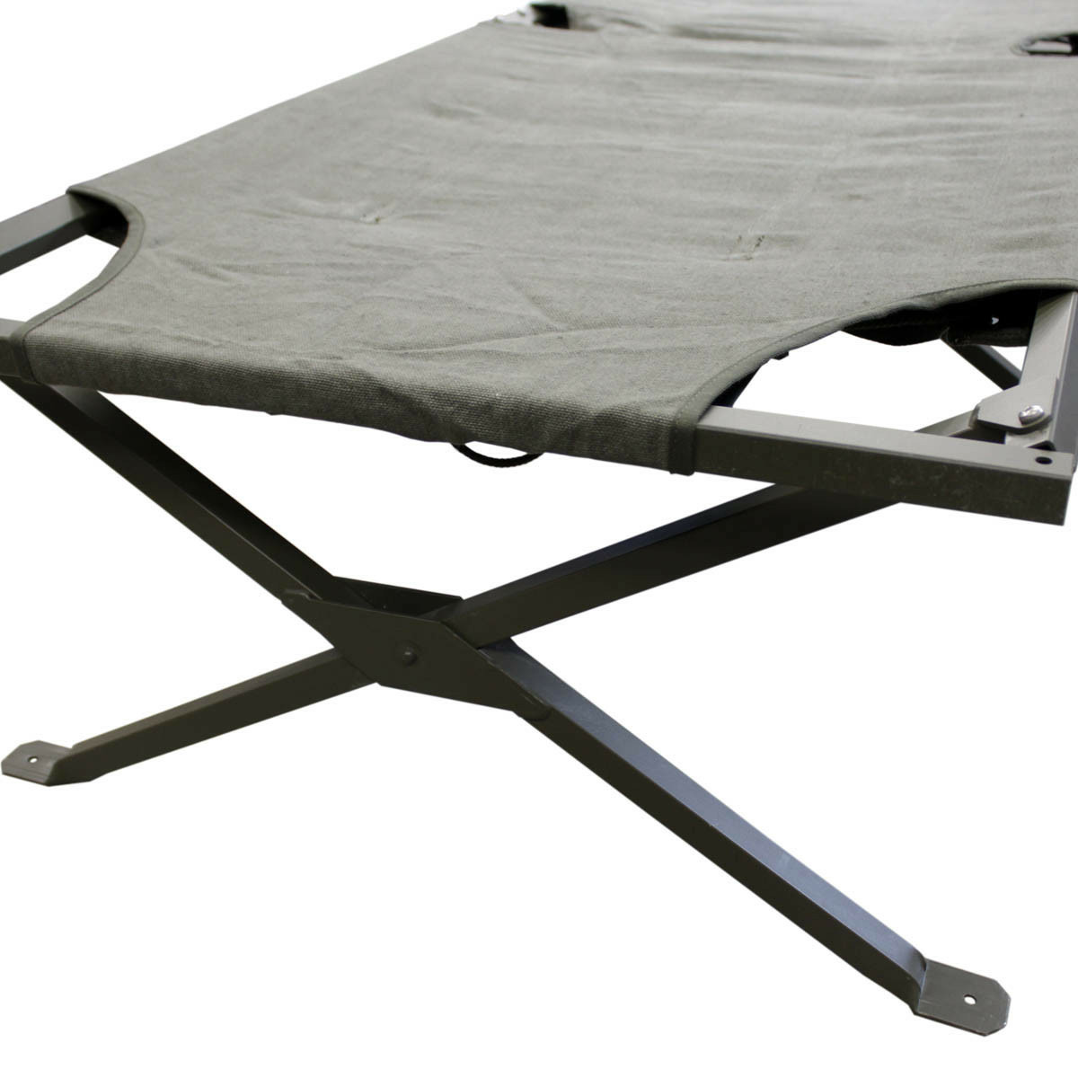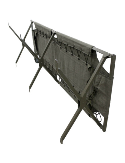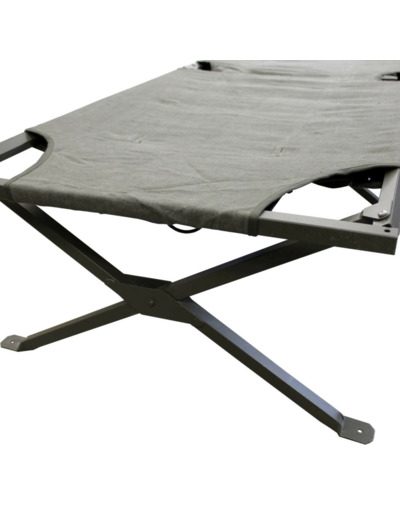 Cadre en acier peint vert armée. Toile en coton ajustable par corde et sangles. Les pieds peuvent être scellés au sol.