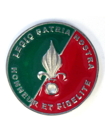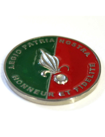 Médaillon en laiton blanc dans son écrin de présentation. Texte et flamme en relief. Face vernie. Dos granuleux.