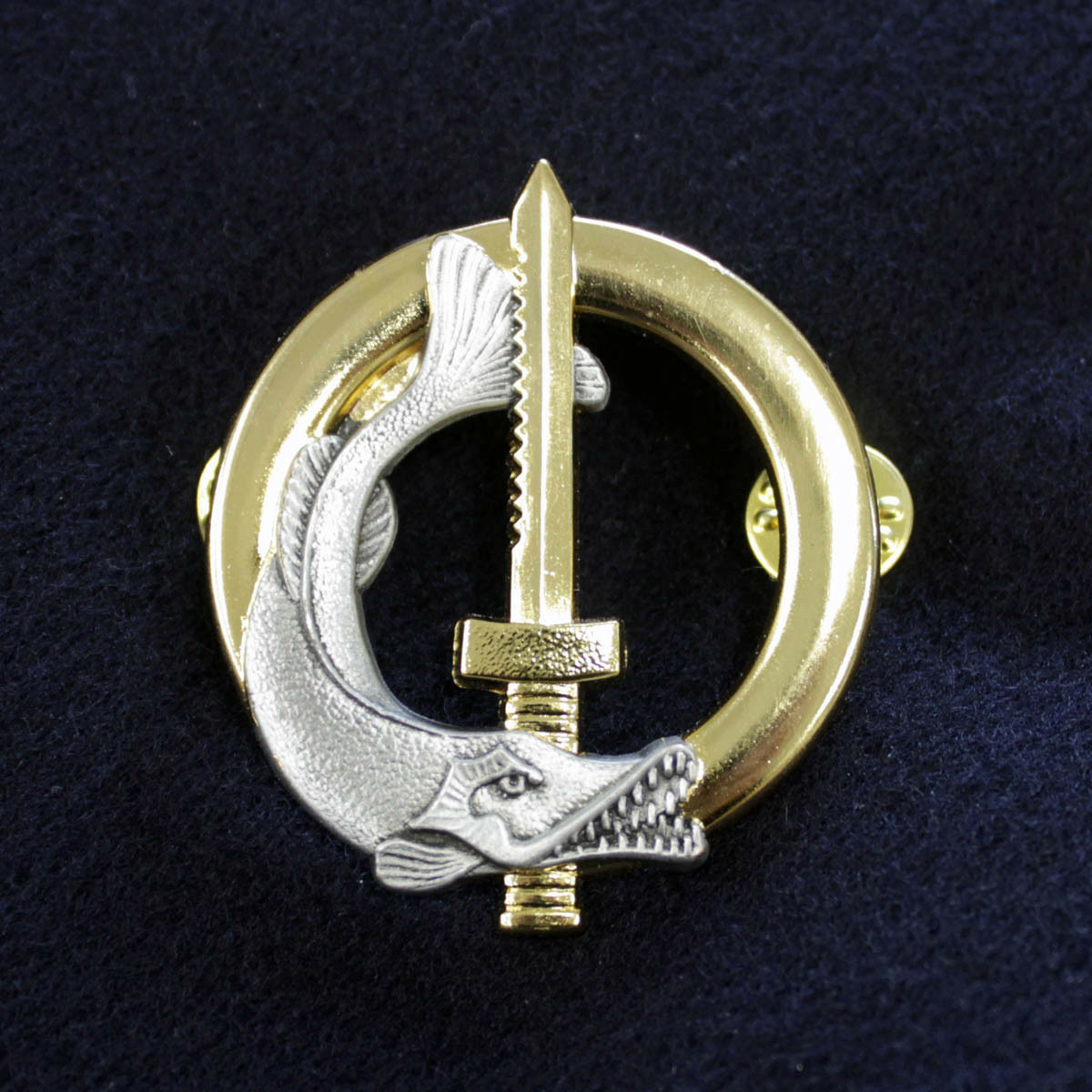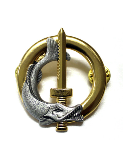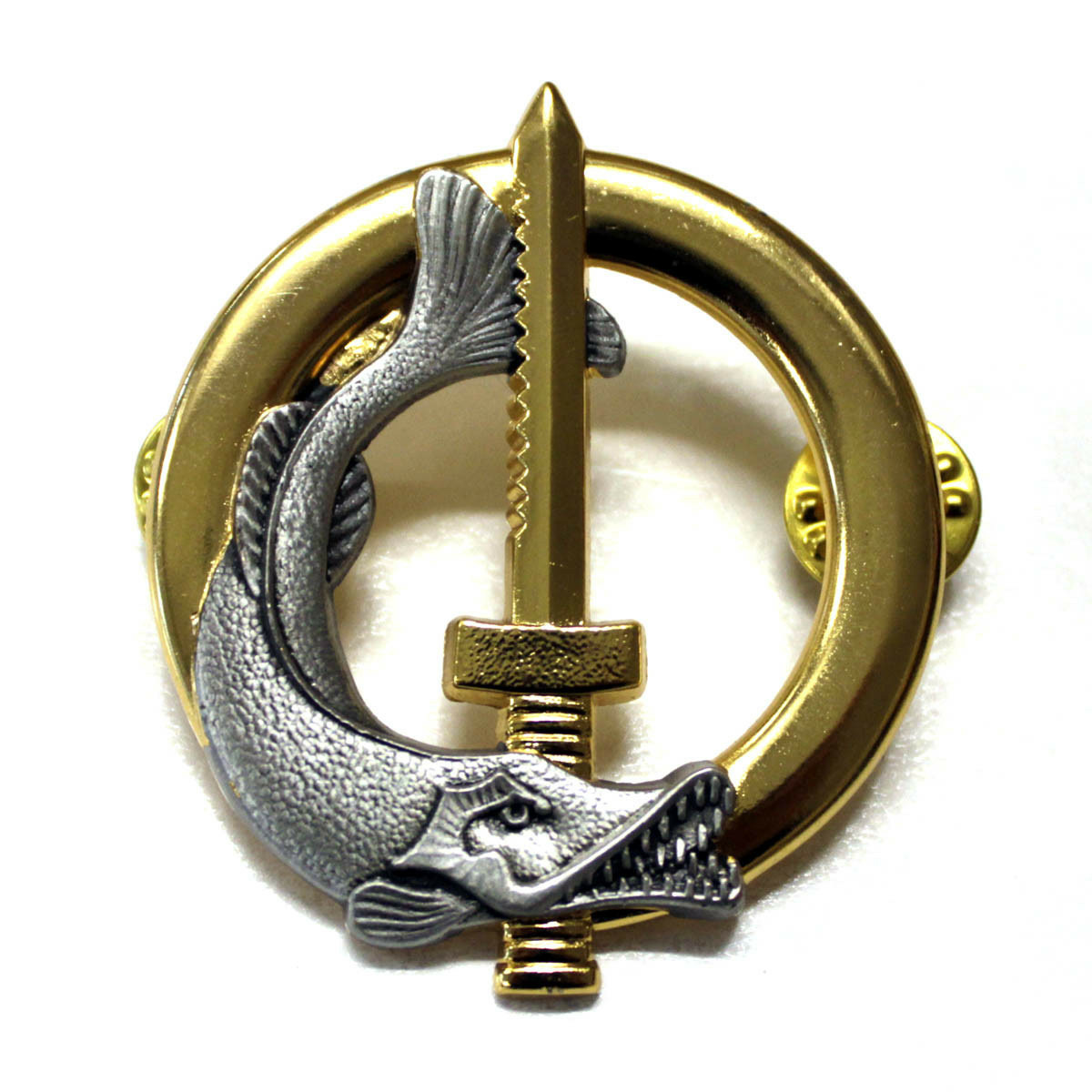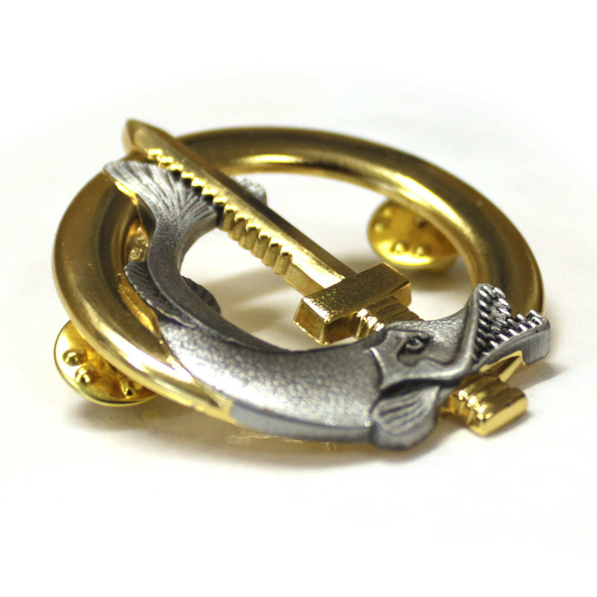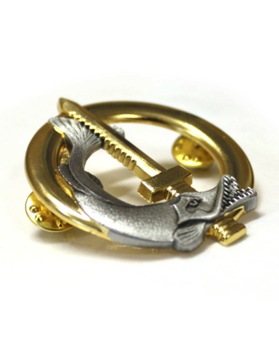 Un brochet argent et un glaive enchâssés sur une bouée en or.
