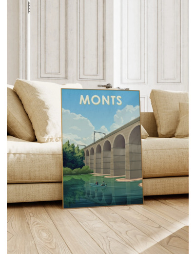 Découvrez notre affiche décorative de la ville de Monts et de son viaduc, une illustration élégante et authentique qui capture l'essence de cette charmante commune située au cœur de la vallée de l'Indre, en Touraine.