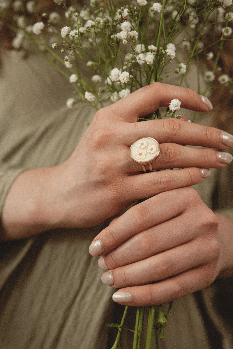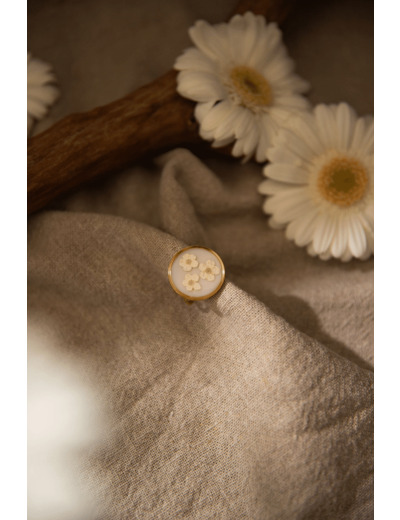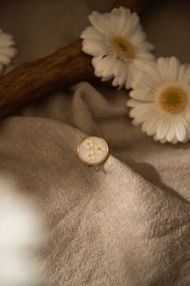 Cette jolie bague dorée au style bohème est ornée de trois petites fleurs de spirée.