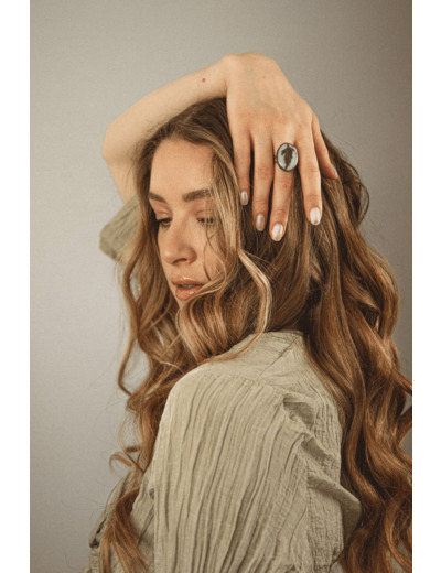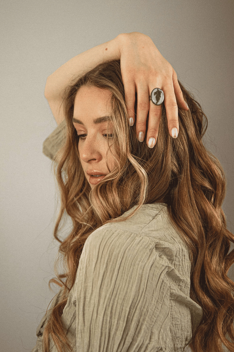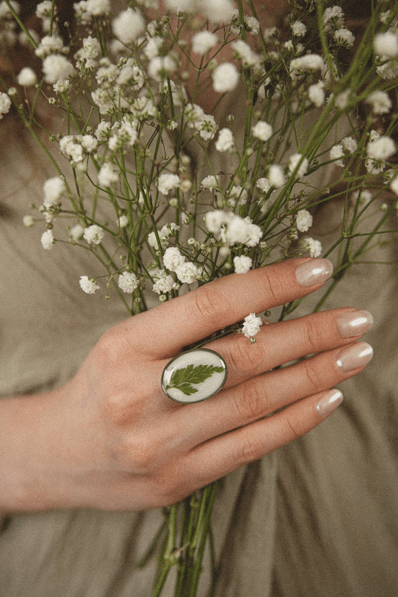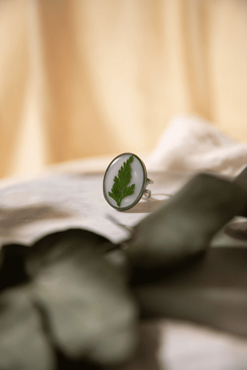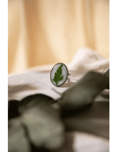 Plongez dans la nature avec cette magnifique bague ovale argentée ornée d'une feuille de fougère délicatement incorporée sur un fond blanc.