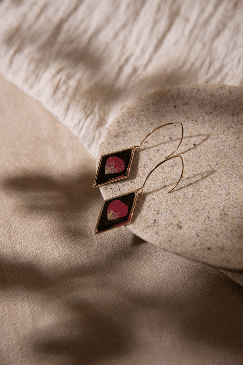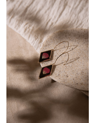 Chaque boucle d'oreille présente une pétale de rose délicate, soigneusement encapsulée sur un fond noir, ajoutant une touche de romantisme à votre style.