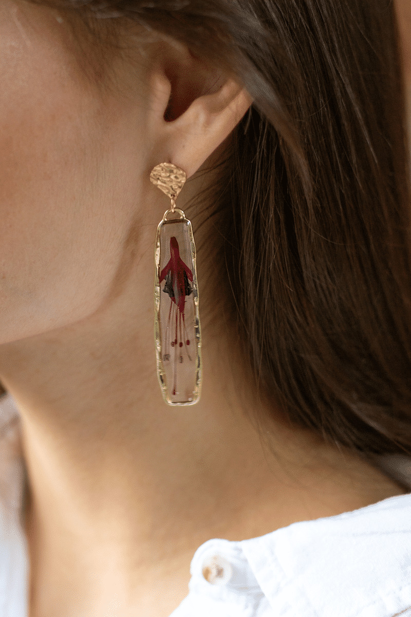 De véritables fleurs de fuschia sont immortalisées dans une résine de qualité.