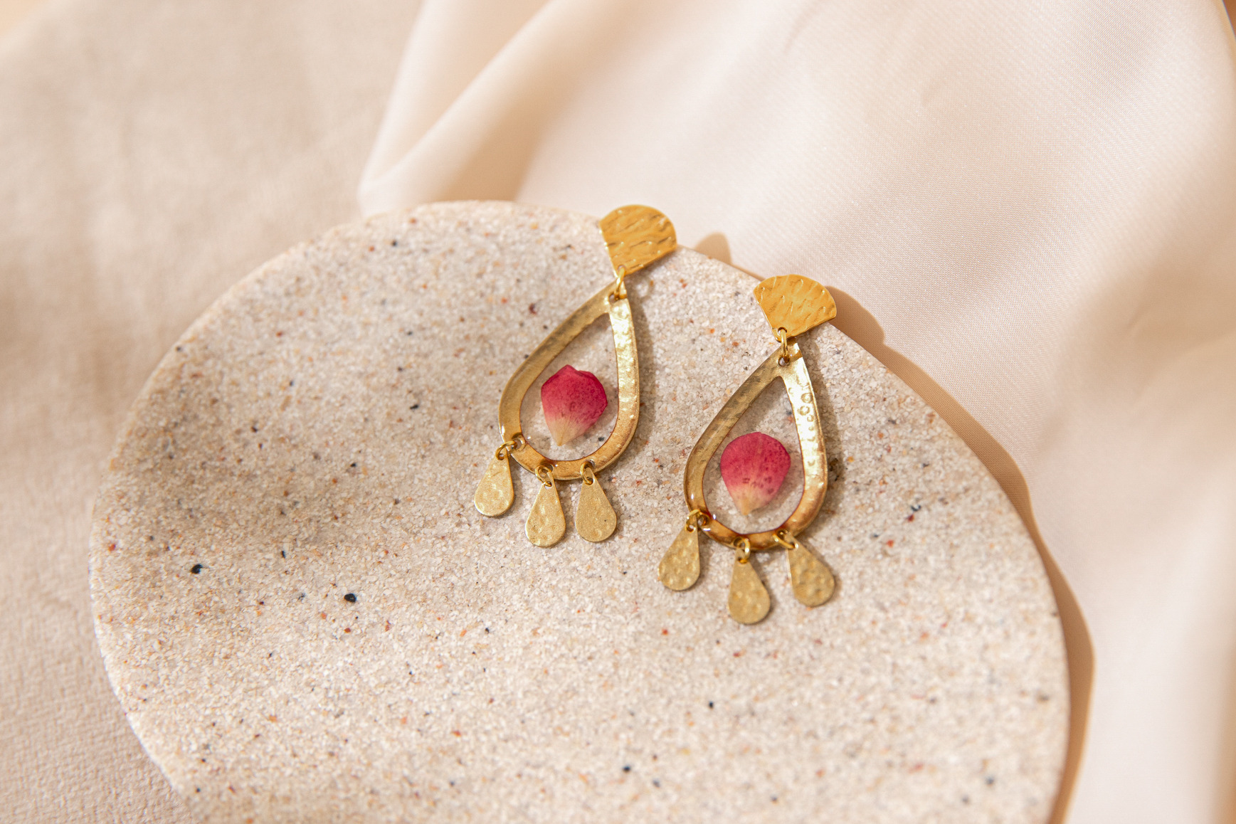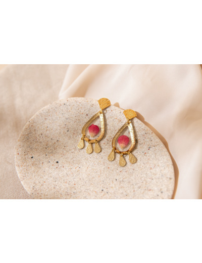 Chaque boucle d'oreille présente une délicate pétale de rose préservée et encapsulée dans de la résine transparente, créant ainsi un aspect unique et naturellement élégant.
