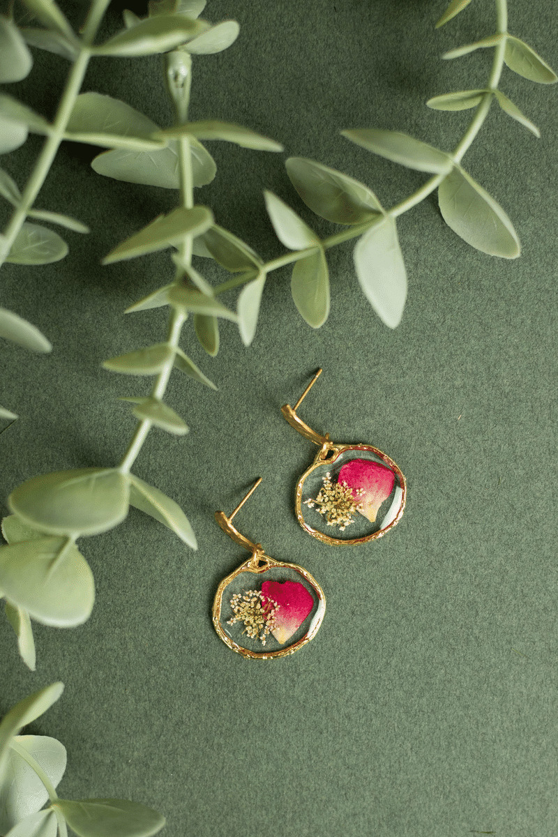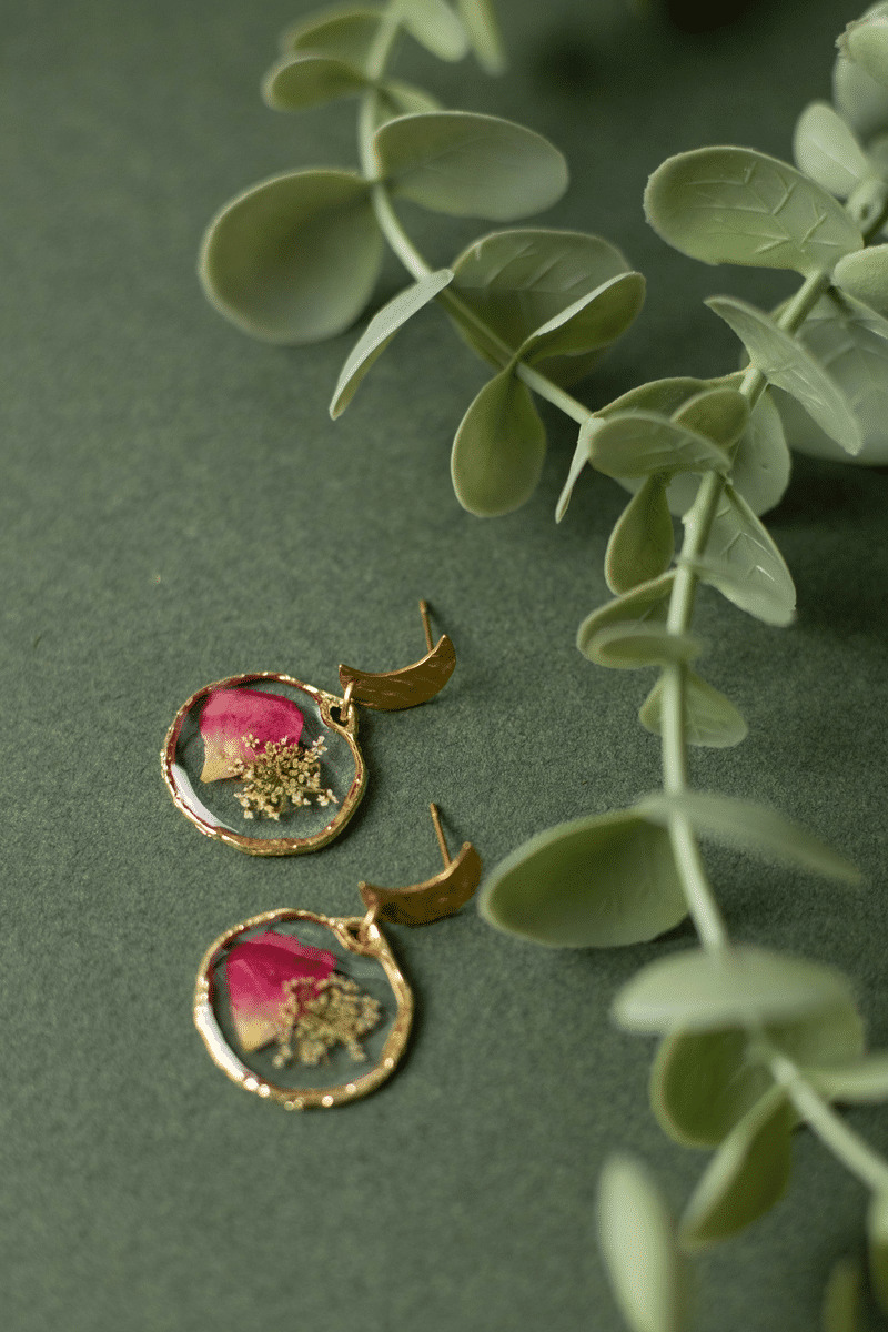 De véritables fleurs de carotte sauvage et une pétale de rosier sauvage sont immortalisées dans une résine de qualité.