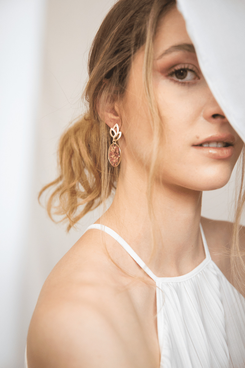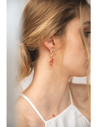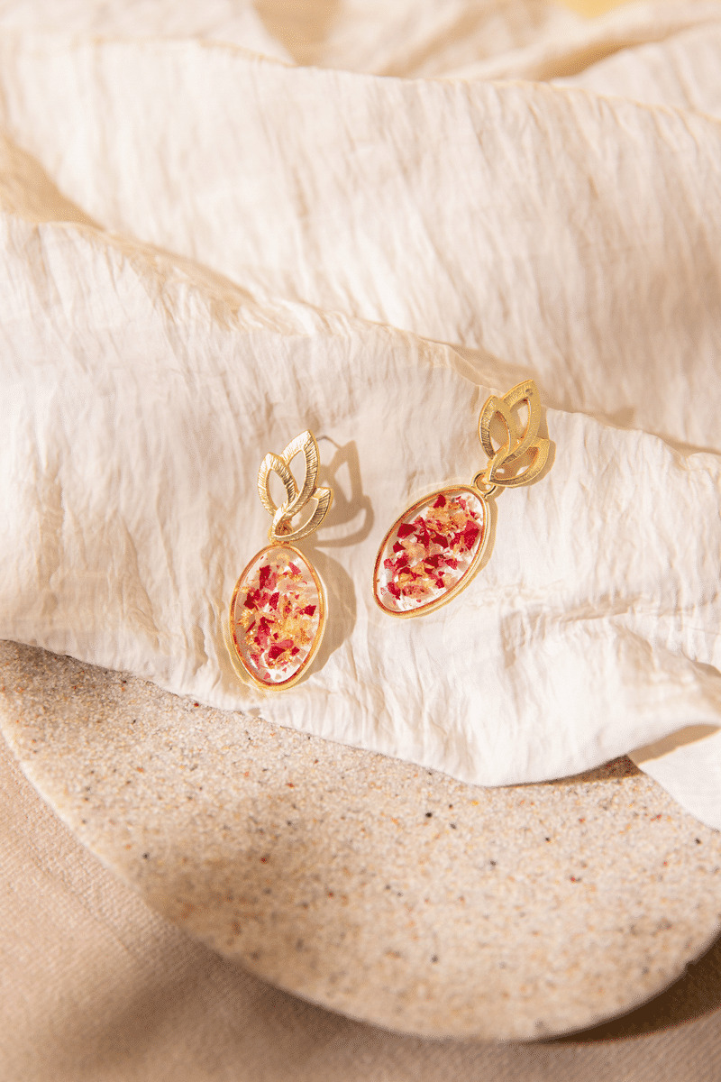 À l'intérieur de chaque boucle, des brisures de fleurs de rosier sont délicatement incorporées dans de la résine transparente, créant un effet subtil et unique.