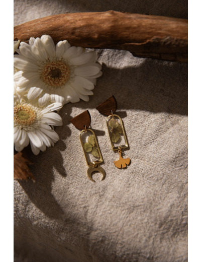 Pour ajouter une touche de nature organique, une pampille en forme de feuille de Ginko Biloba balance gracieusement d'une boucle, tandis qu'une autre en forme de croissant de lune ajoute une allure mystique à l'autre.