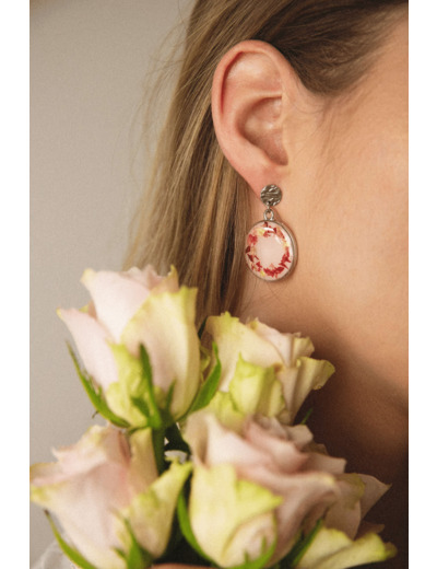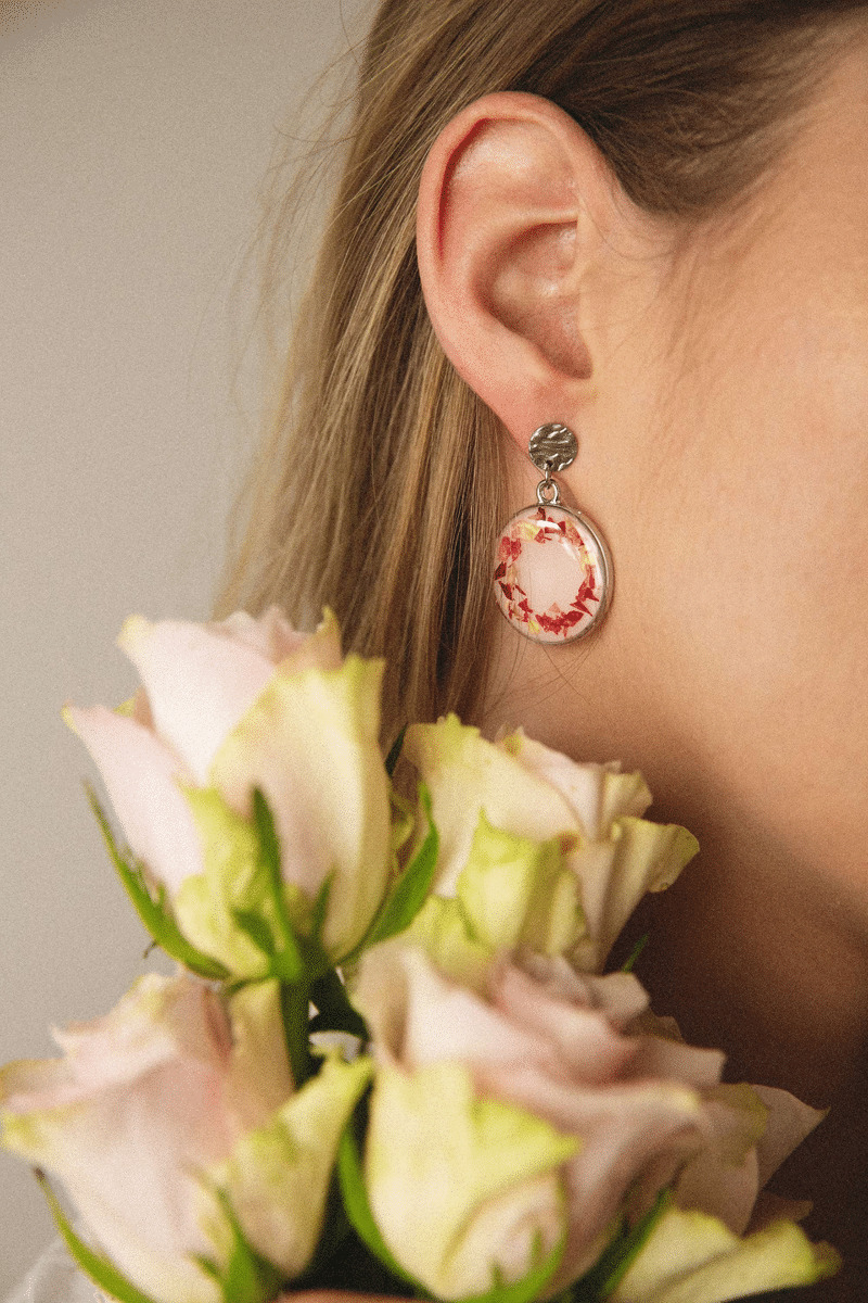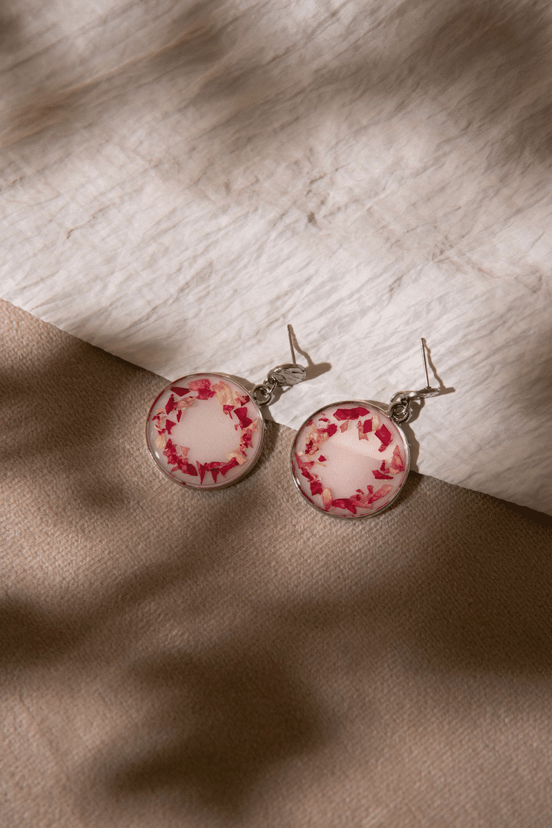 Chaque boucle d'oreille est ornée de brisures de pétales de rose, répandant une aura de romance et de féminité.