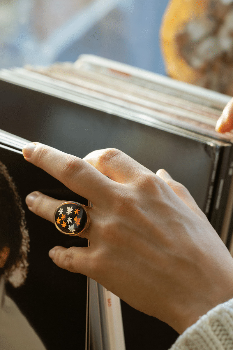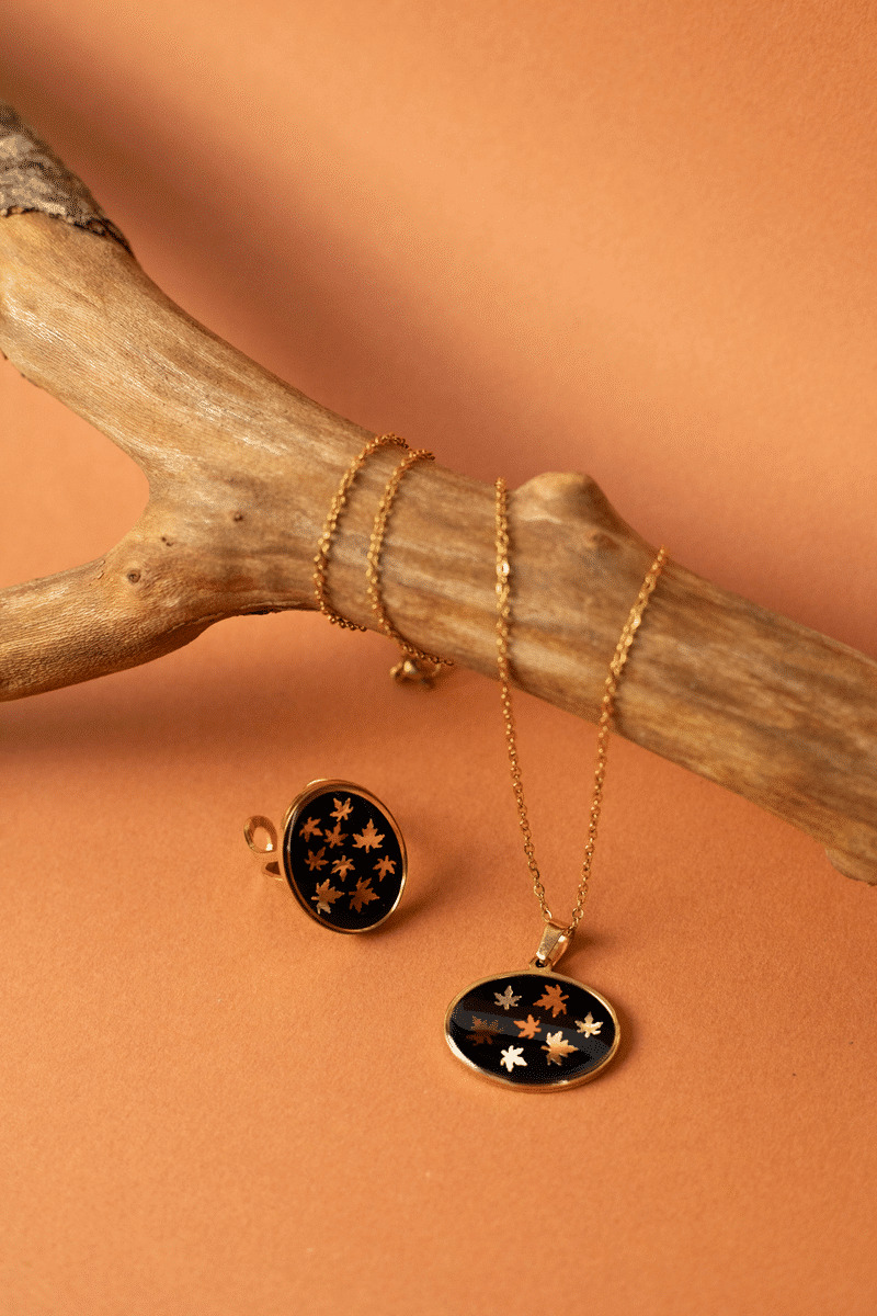 Cette merveilleuse parure automnale se compose d'une bague en acier inoxydable doré, ajustable à votre taille, et d'un collier à chaîne inoxydable de 50 cm, pour vous charmer de ses feuilles d'érables aux couleurs chatoyantes.