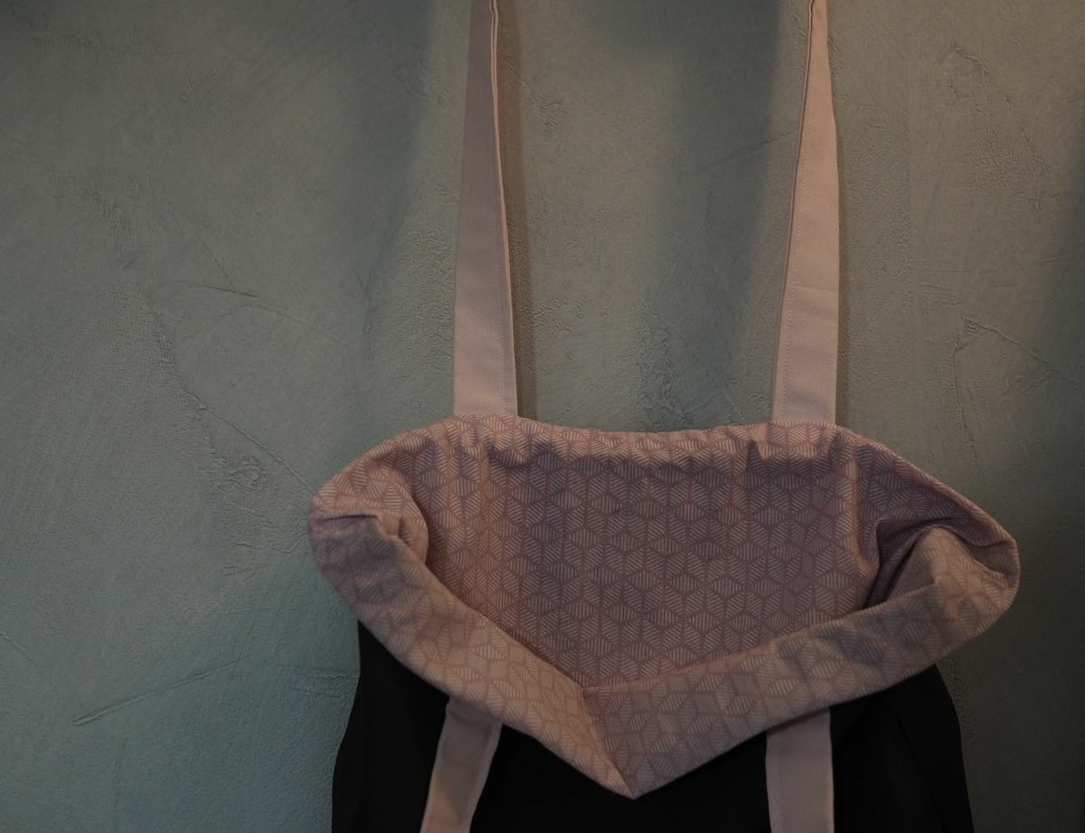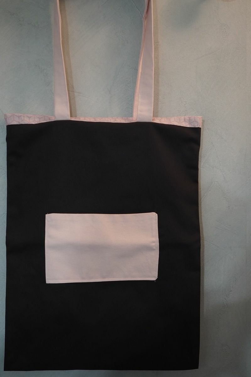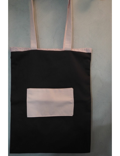 Sac tote bag tissu noir extérieur, rose à l'intérieur. Grandes anses. pochette tissu extérieure. Grand modèle.