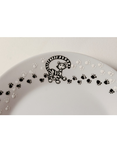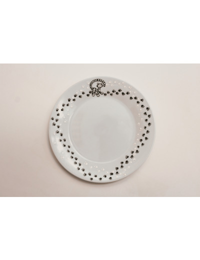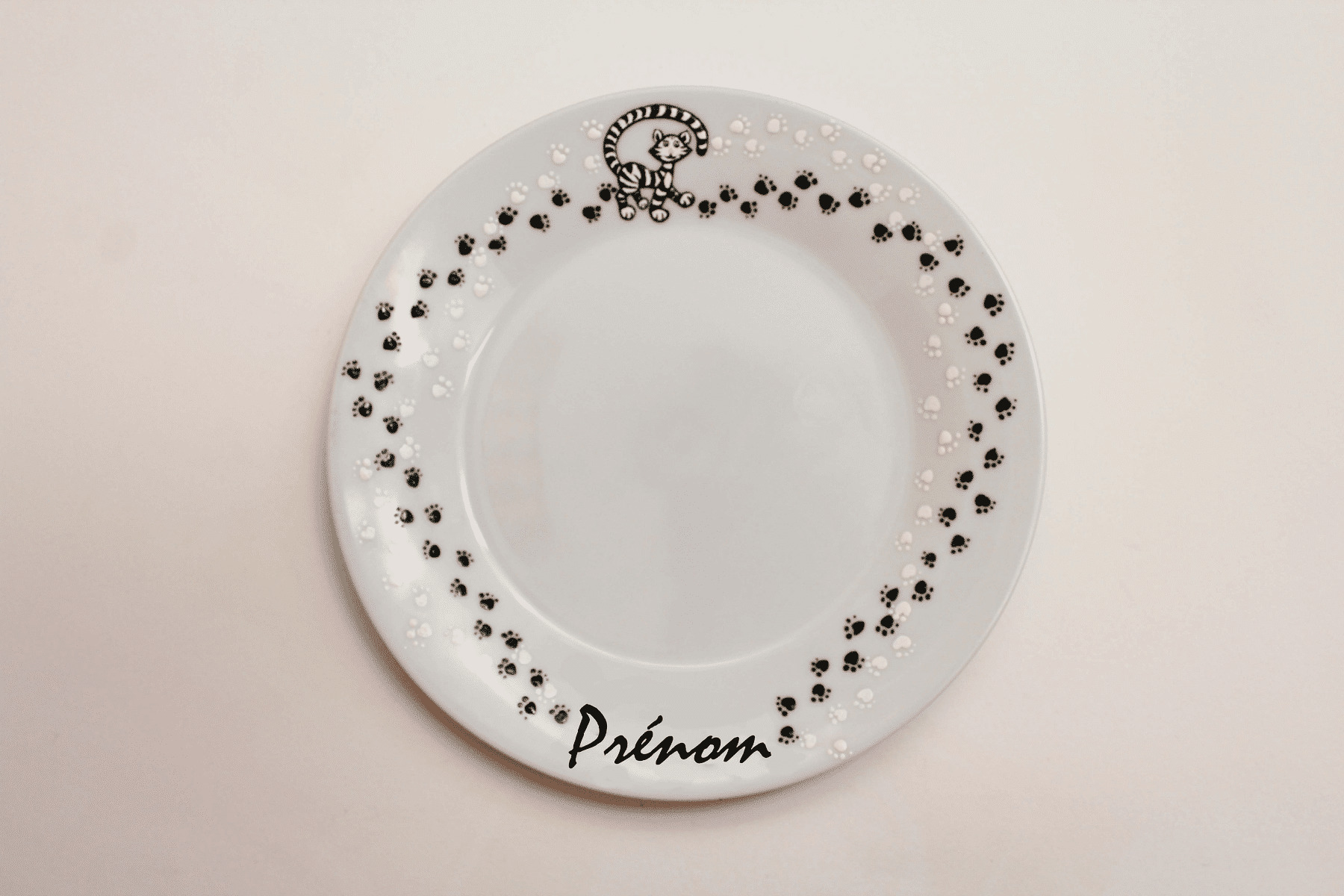 Assiette en porcelaine peinte à la main personnalisable du prénom de votre enfant, d’initiales ou d'un petit message. 19 cm de diamètre. Un charmant petit chaton se promène joyeusement tout autour de l'assiette en y laissant ses empruntes de pattes!