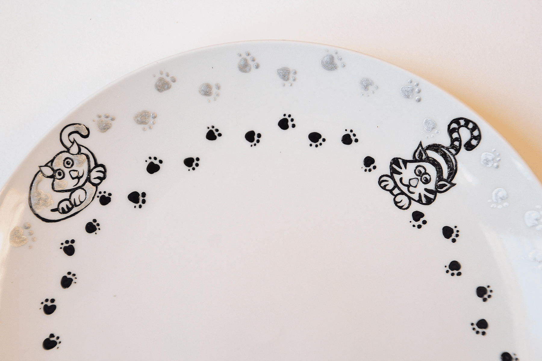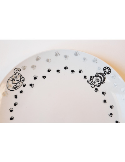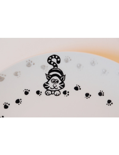 Assiette en porcelaine peinte à la main d'environ 19 centimètres marquée du prénom de votre enfant ou d'un petit message. De charmants petits chatons se promènent joyeusement sur la porcelaine.