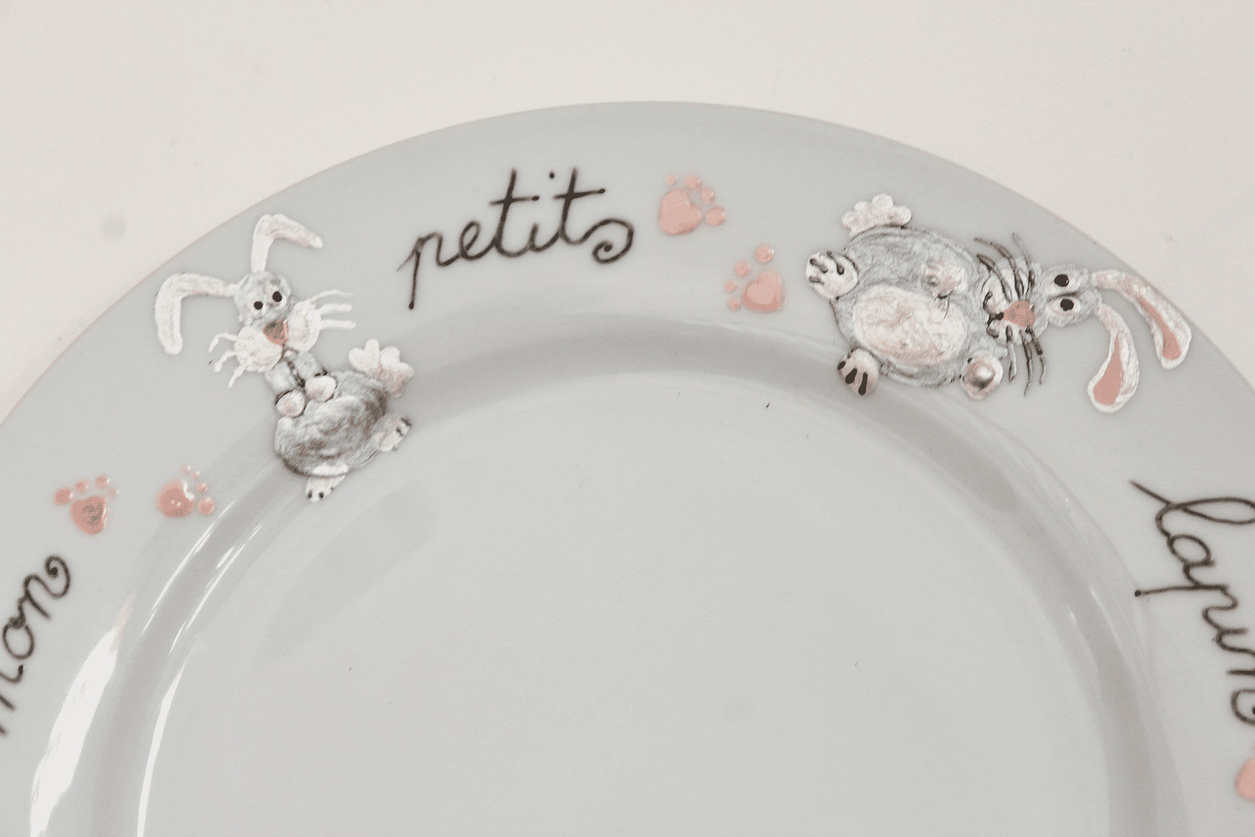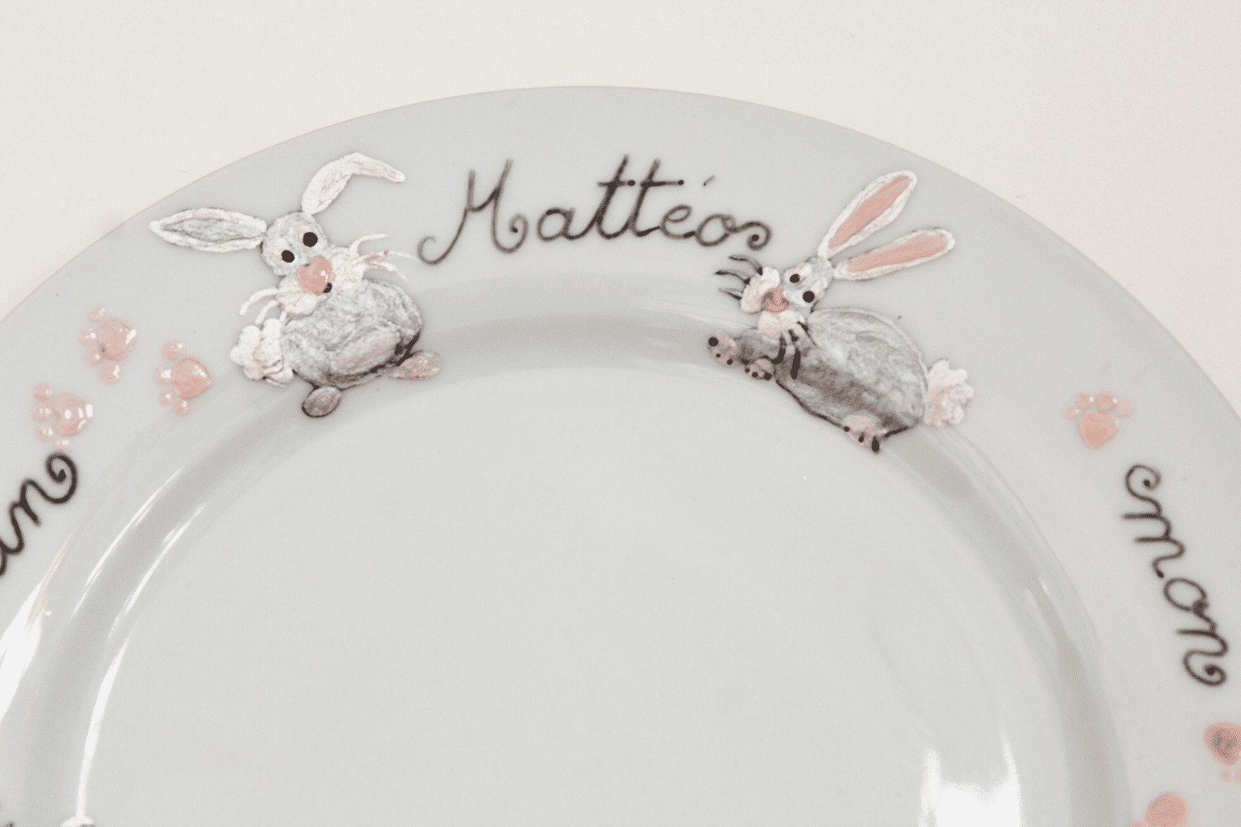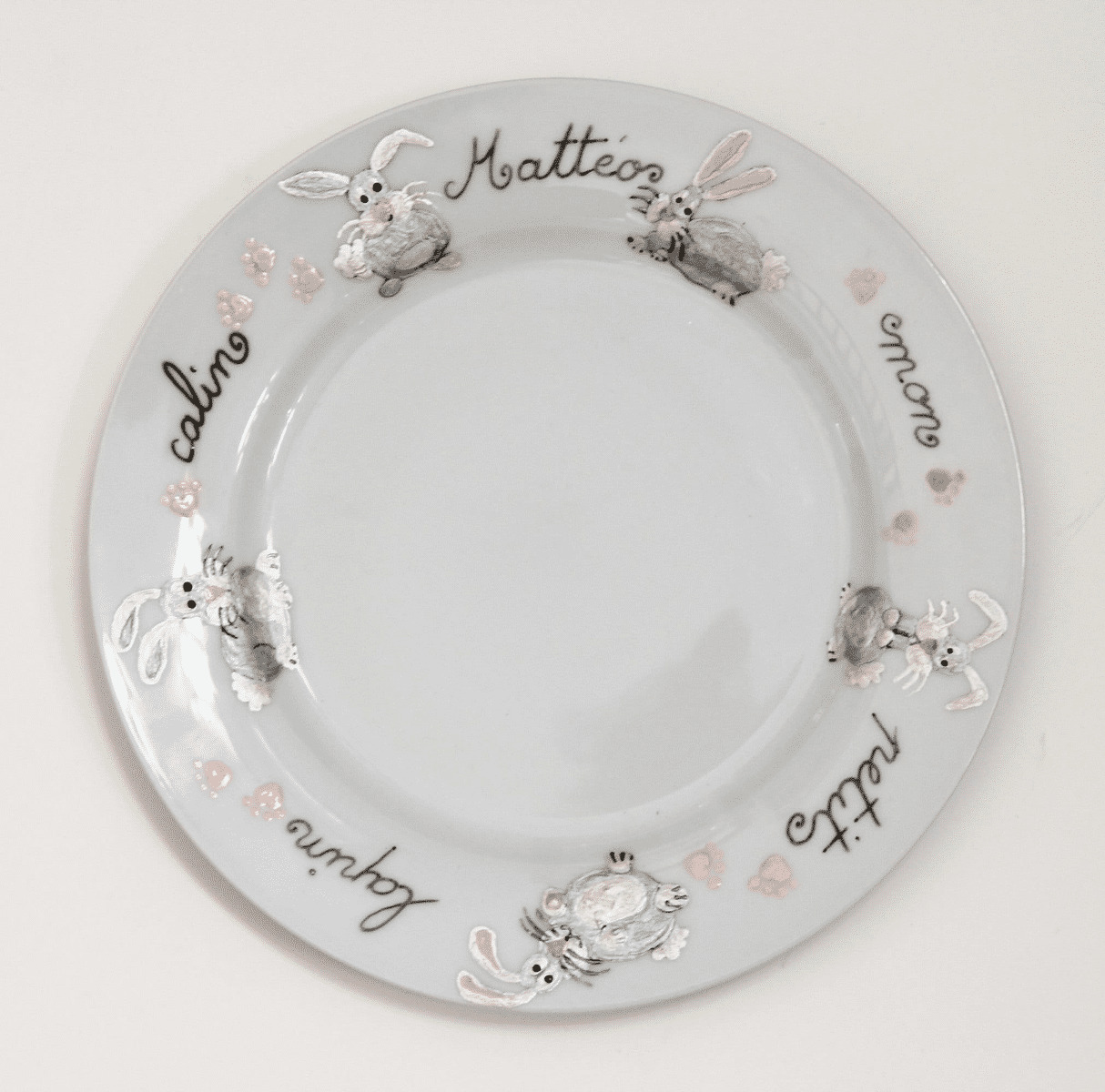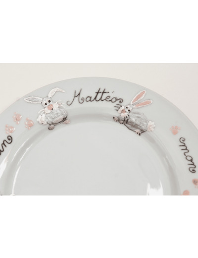Assiette en porcelaine peinte à la main, d'environ 19 centimètres, marquée du prénom de votre enfant ou d'un petit message. De charmants petits lapins se promènent joyeusement sur la porcelaine.