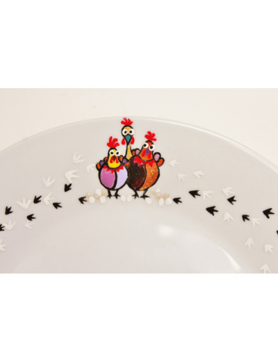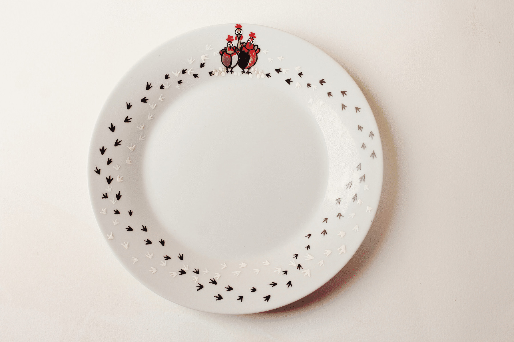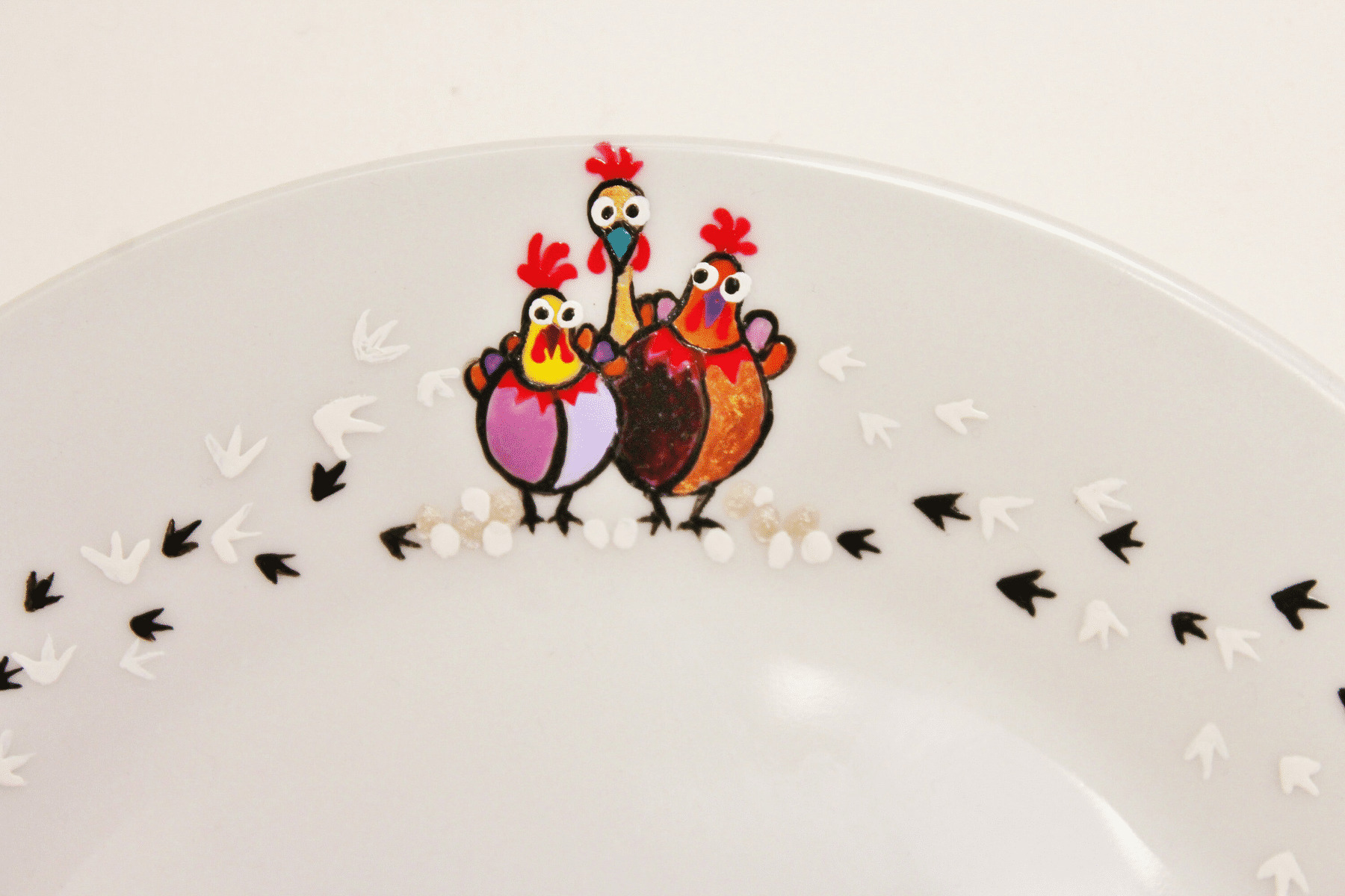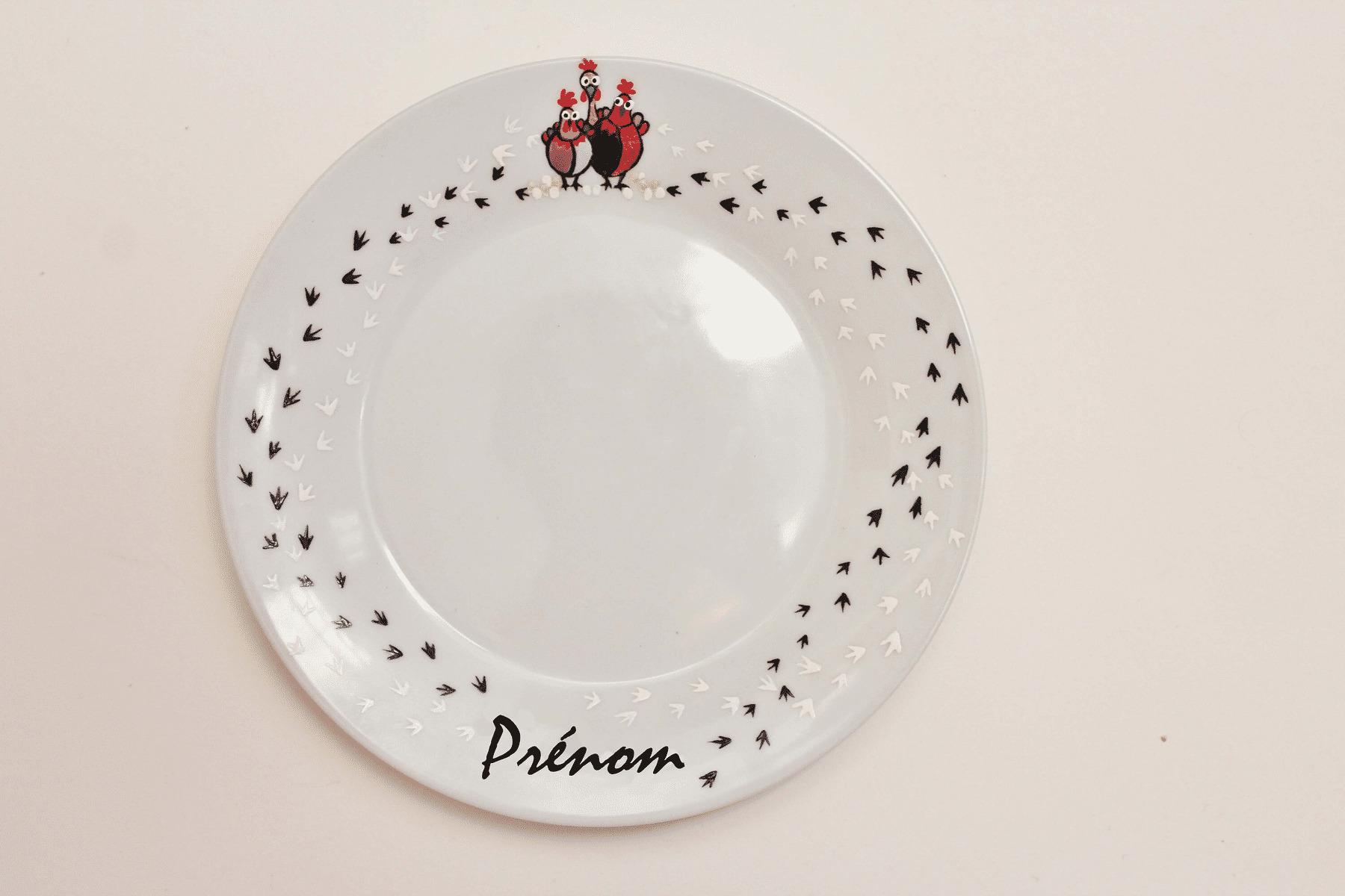 Assiette en porcelaine peinte à la main personnalisable d'un prénom, d’initiales ou d'un petit message (19cm). Une charmante petite poule vous observe d'un air interrogateur. Elle a laissé les empruntes de ses pattes tout autour de l'assiette!
