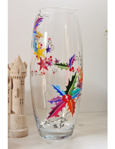Vase peint à la main , pièce unique, très colorée sur le thème de Noël, une guirlande de feuilles de houx et d'étoiles grimpent le long des parois du vase. Celui-ci saura très certainement trouver sa place au sein de votre foyer durant les fêtes.