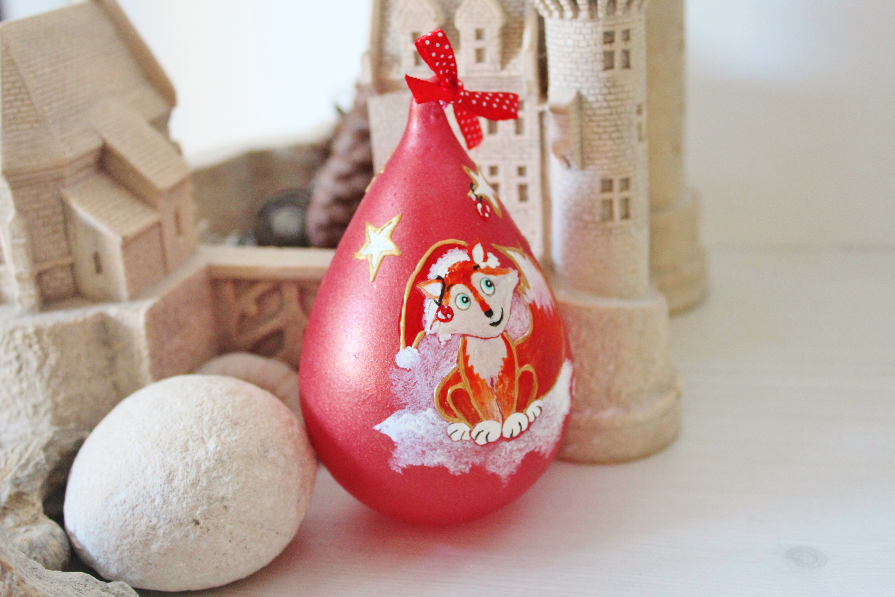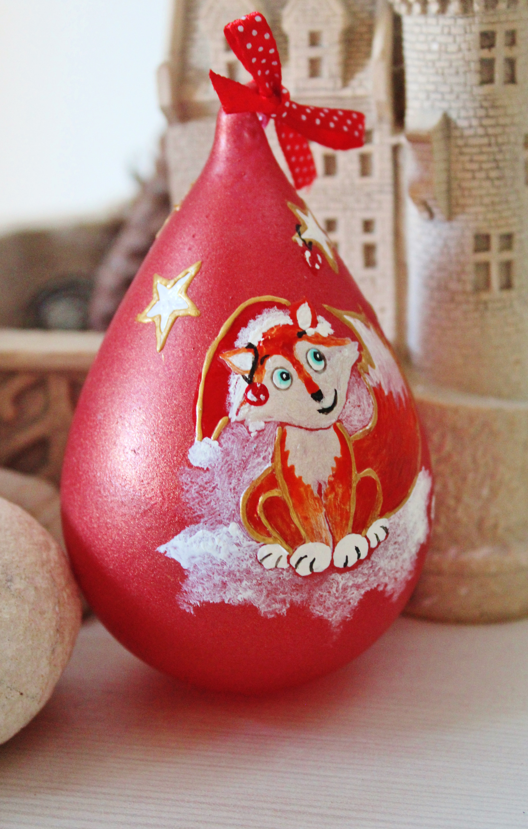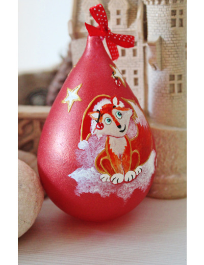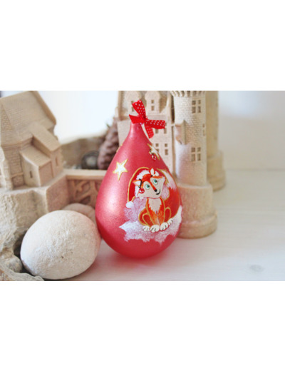 Boule de noël en verre, peinte à la main et unique, en forme de goutte d'eau, 7 centimètres de diamètre par 11 centimètres de haut , à suspendre dans votre sapin. Un adorable petit renard roux, dans une ambiance enneigée, veillera sur toute la famille perchée sur l' une des branches de votre sapin.