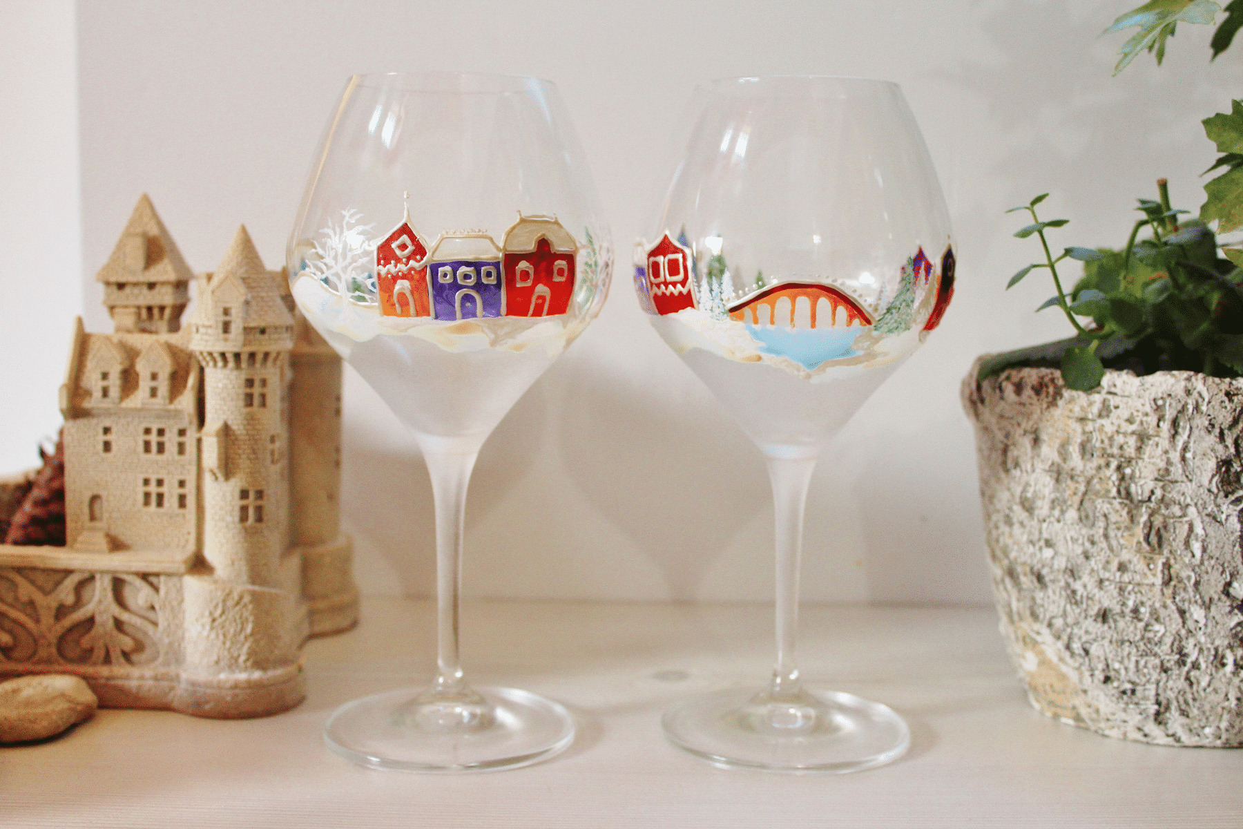 Duo De Deux Verres À Pied Peints À La Main Sur Le Thème De Noël Représentant Un Joli Petit Village Sous La Neige Verre Signé Personnalisable