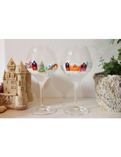 Duo de deux jolis grands verres à vin peint à la mais dans des coloris doux sur le thème de Noël. Un joli petit village enneigé attend le père-Noël!