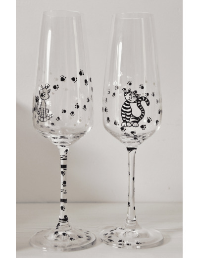 Duo de deux jolies flutes en cristal, dans les couleurs noires et blanches, entièrement peintes à la main sur le thème de nos amis les chats. Chaque verre à pied est unique en son genre et peut être personnalisé par des initiales ou un prénom. Ils sauront égayer vos moments festifs à table, autour d'un bon repas.