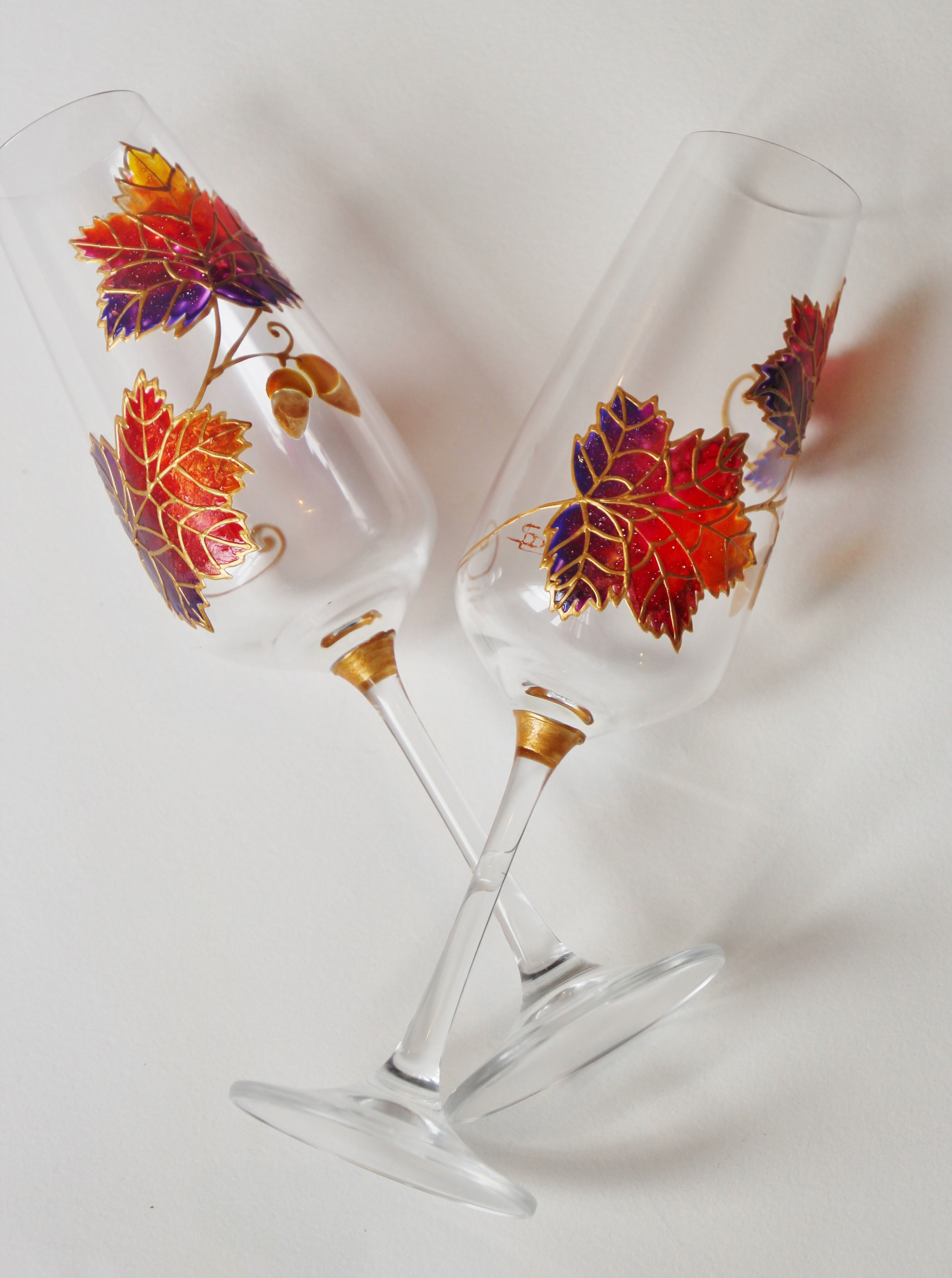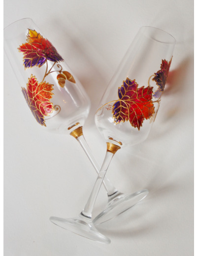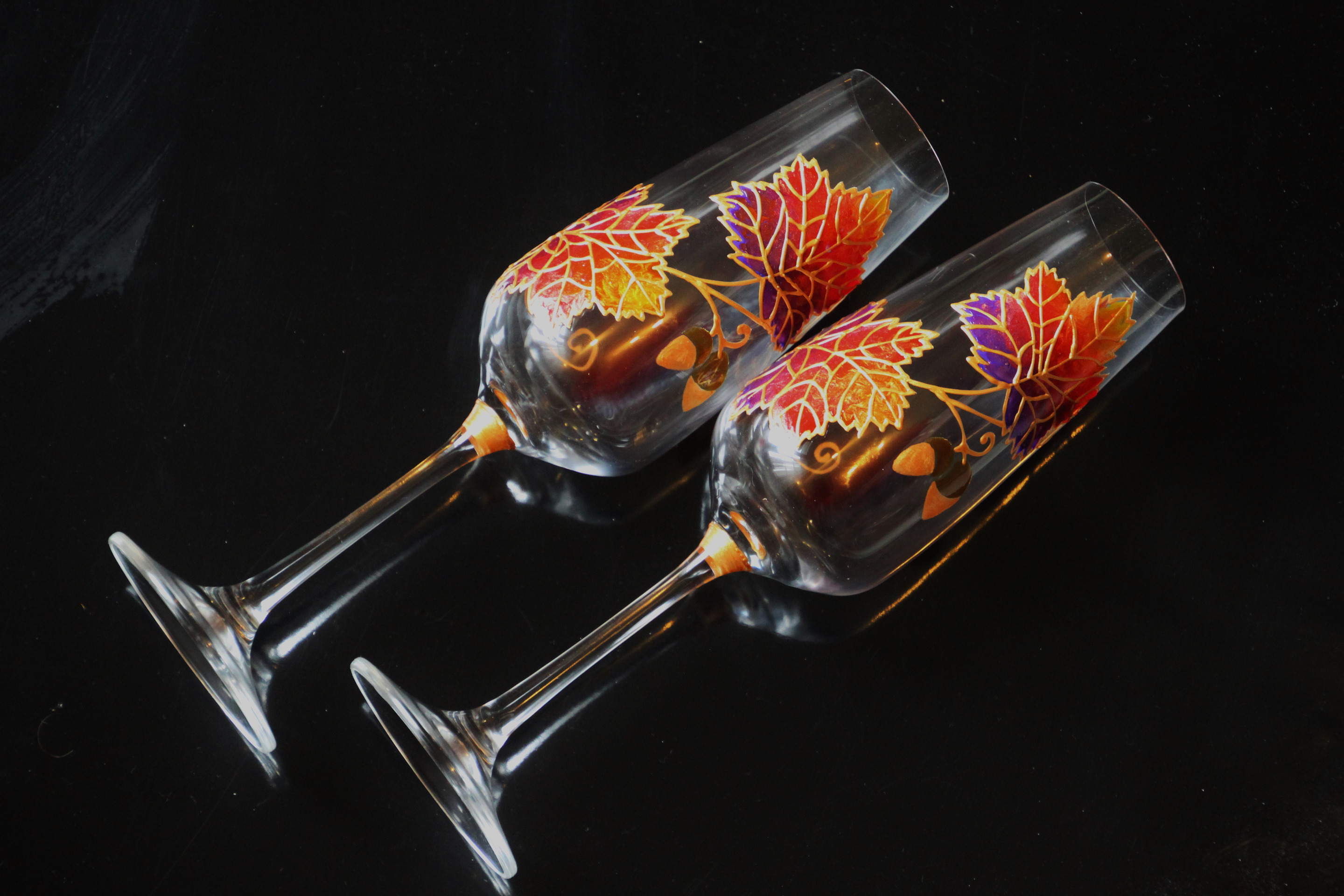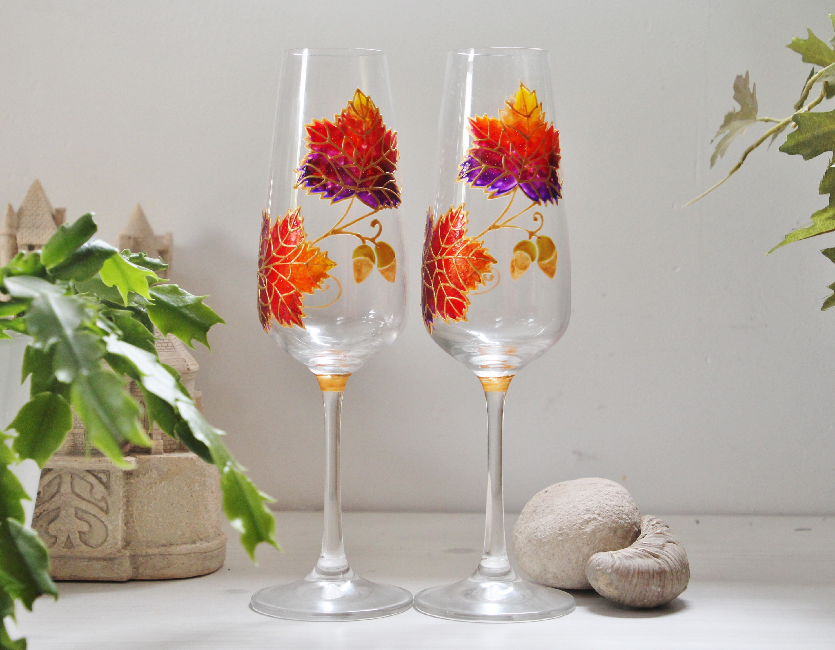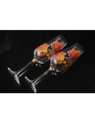 Duo de deux jolies flutes en cristal, dans les couleurs rouges orangées, entièrement peintes à la main sur le thème de cette belle saison qu'est l'automne et de ses feuilles mortes.