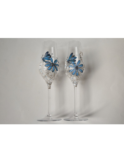 Quel joli cadeau que ces deux jolies flutes entièrement peintes à la main et décorées de strass dans les coloris bleus et blancs. Dans un cadre champêtre de jolies petites libellules volent de fleur en fleur. Chaque verre à pied est unique en son genre et peut être personnalisé par des initiales ou un prénom. Ils sauront égayer vos moments festifs à table, autour d'un bon repas.
