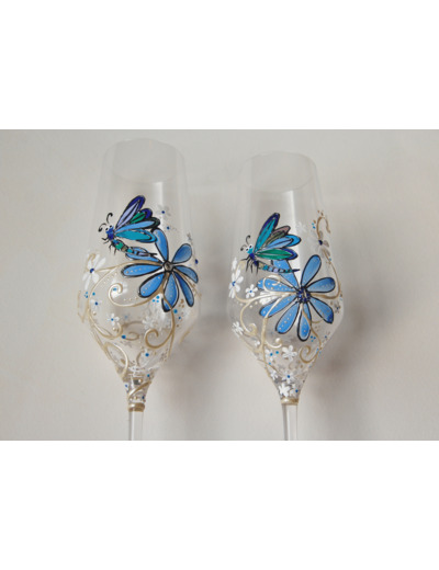 Duo De Flutes À Champagne Peintes À La Main Avec Strass Décorées De Libellules Dans Les Tons Bleus Voletant De Fleur En Fleur