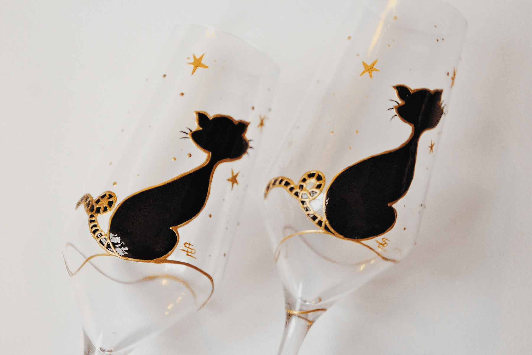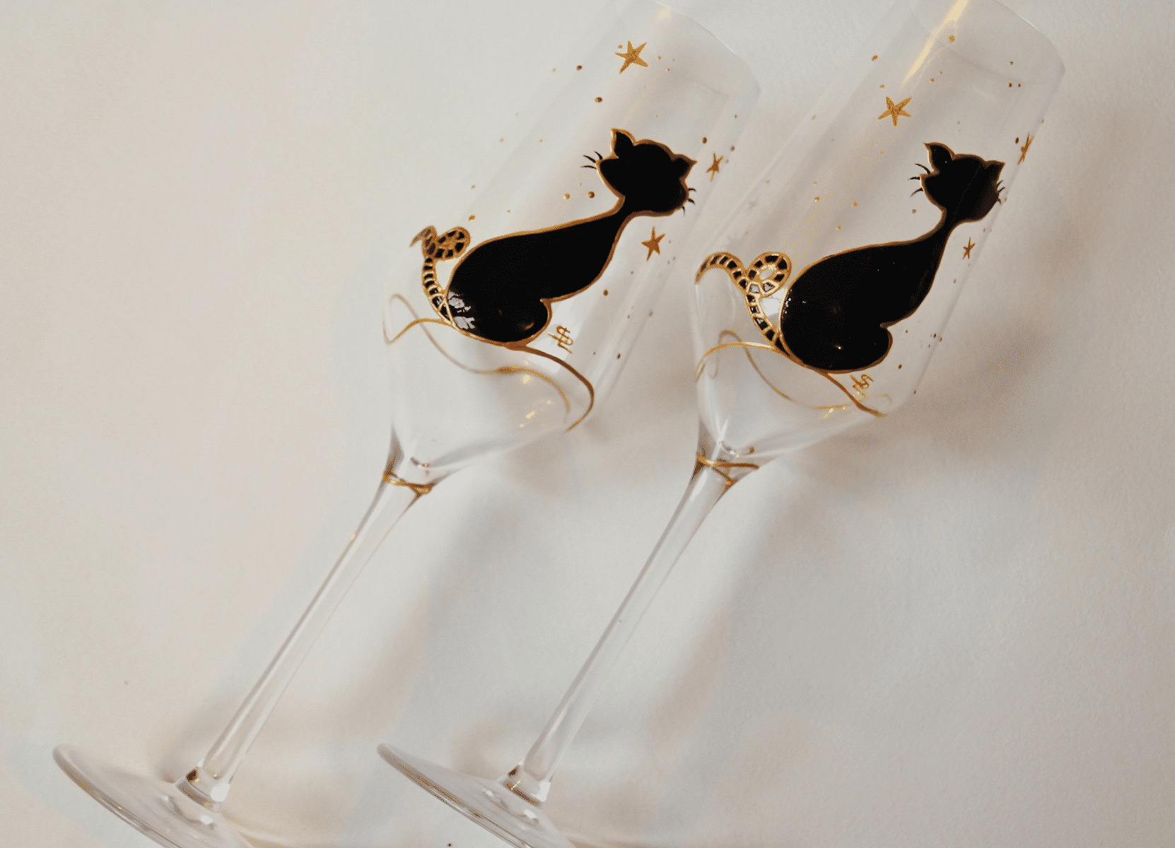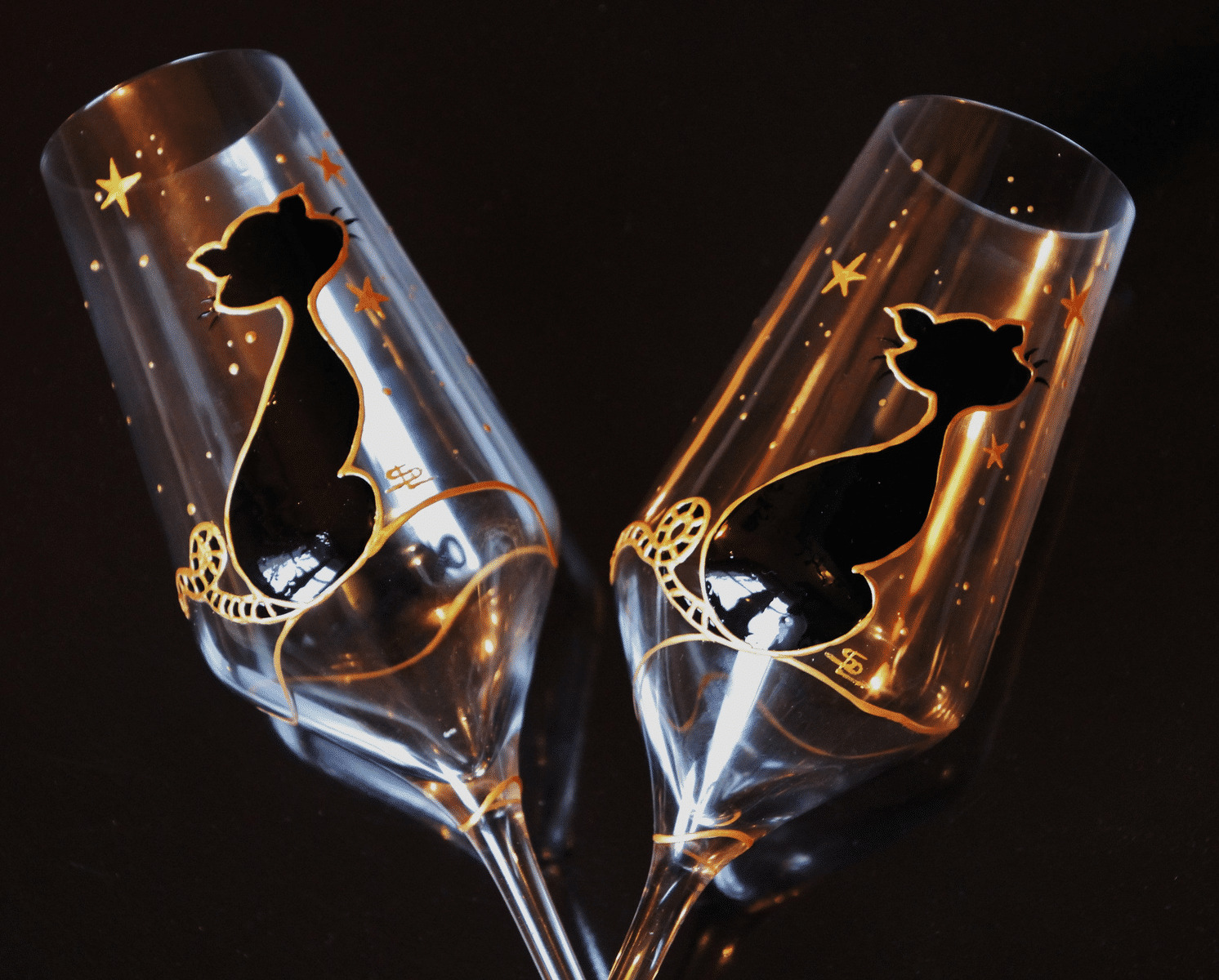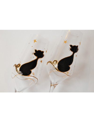 Duo De Flutes À Champagne Peintes À La Main Représentant Un Petit Chat Noir Sous Les Étoiles Dorées, Verres Personnalisables