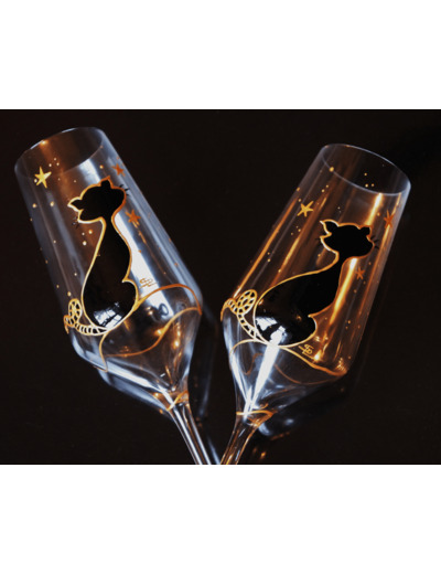 Duo de deux jolies flutes dorées peintes à la main. Ces verres sont entièrement peints à la main sur le thème de nos amis les chats. Ces deux petits minous admirent le ciel étoilé. Chaque verre à pied est unique en son genre et peut être personnalisé par des initiales ou un prénom. Ils sauront égayer vos moments festifs à table, autour d'un bon repas.