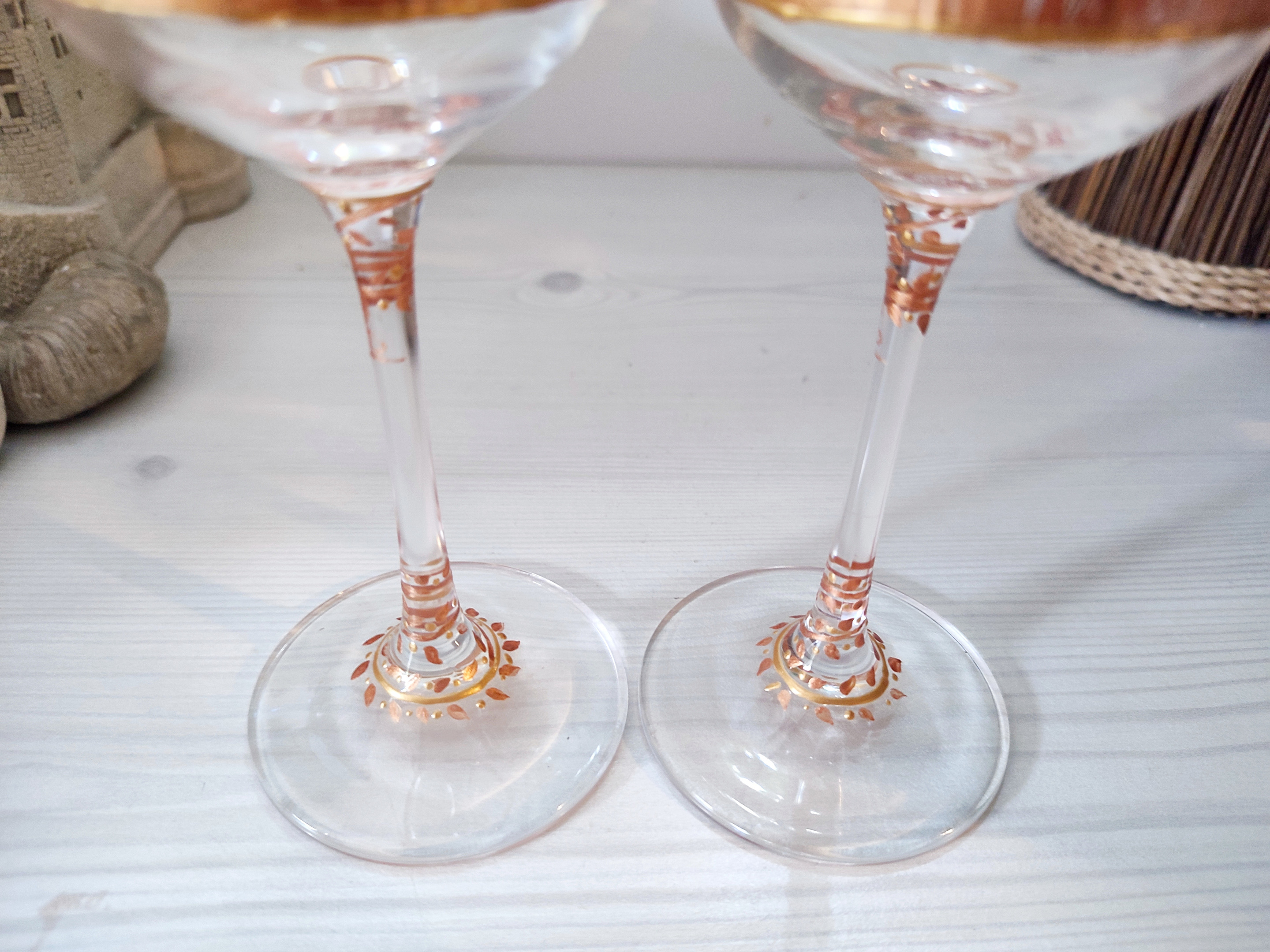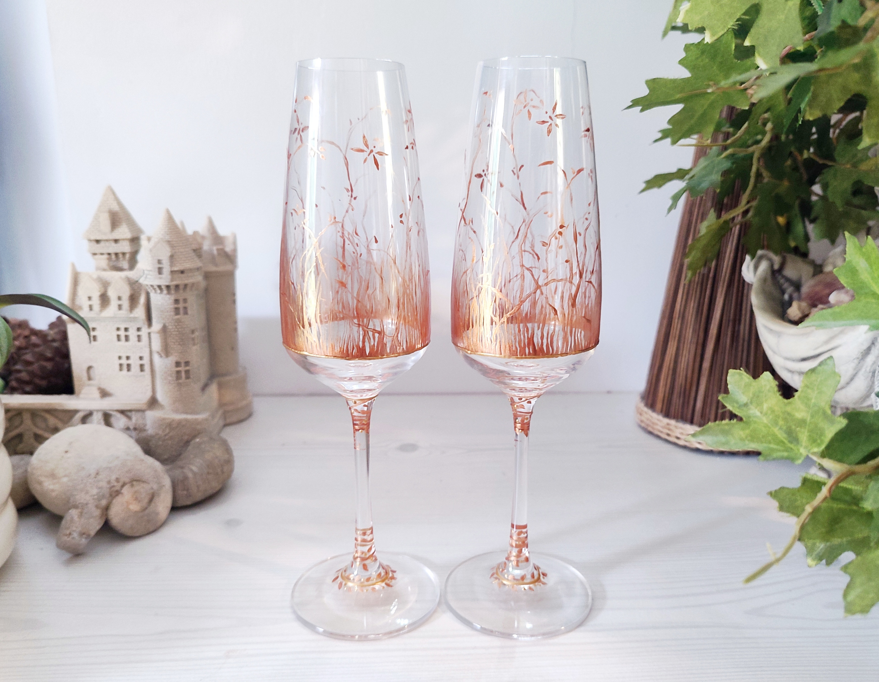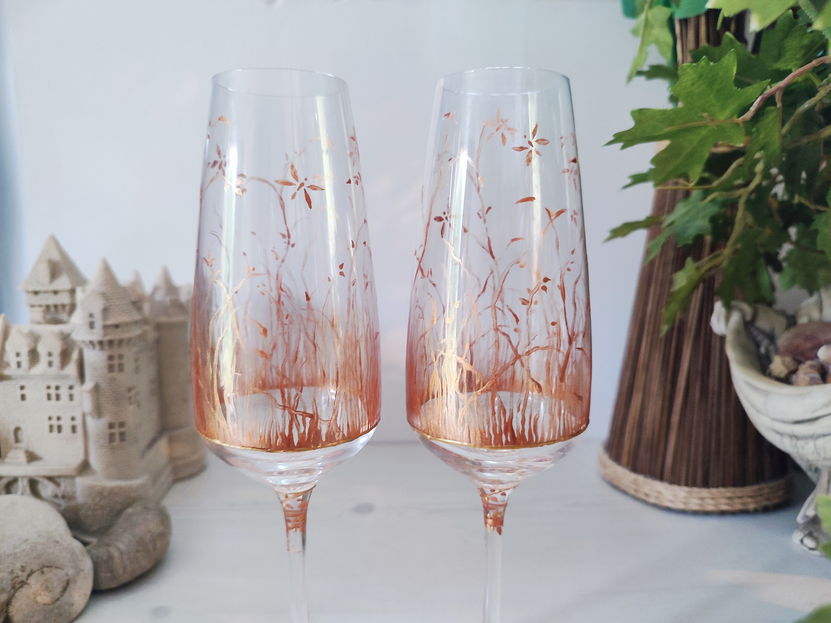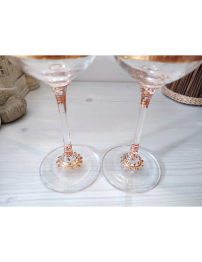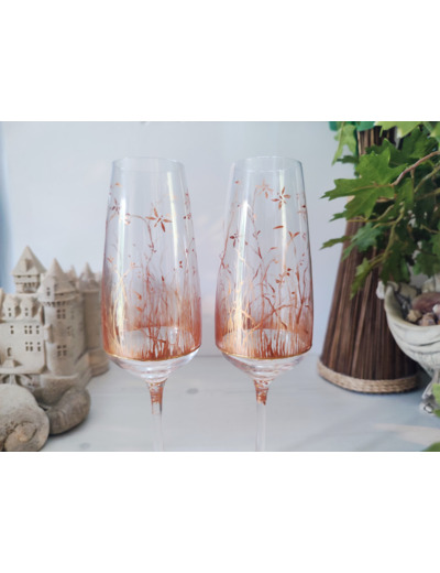 Jolies flutes dorées peintes à la main. Ces verres sont Jolies flutes dorées peintes à la main. Ces verres sont en cristal de bohème. Le décor représente l'envole de petites libellules dans les hautes herbes au milieu des hautes herbes.