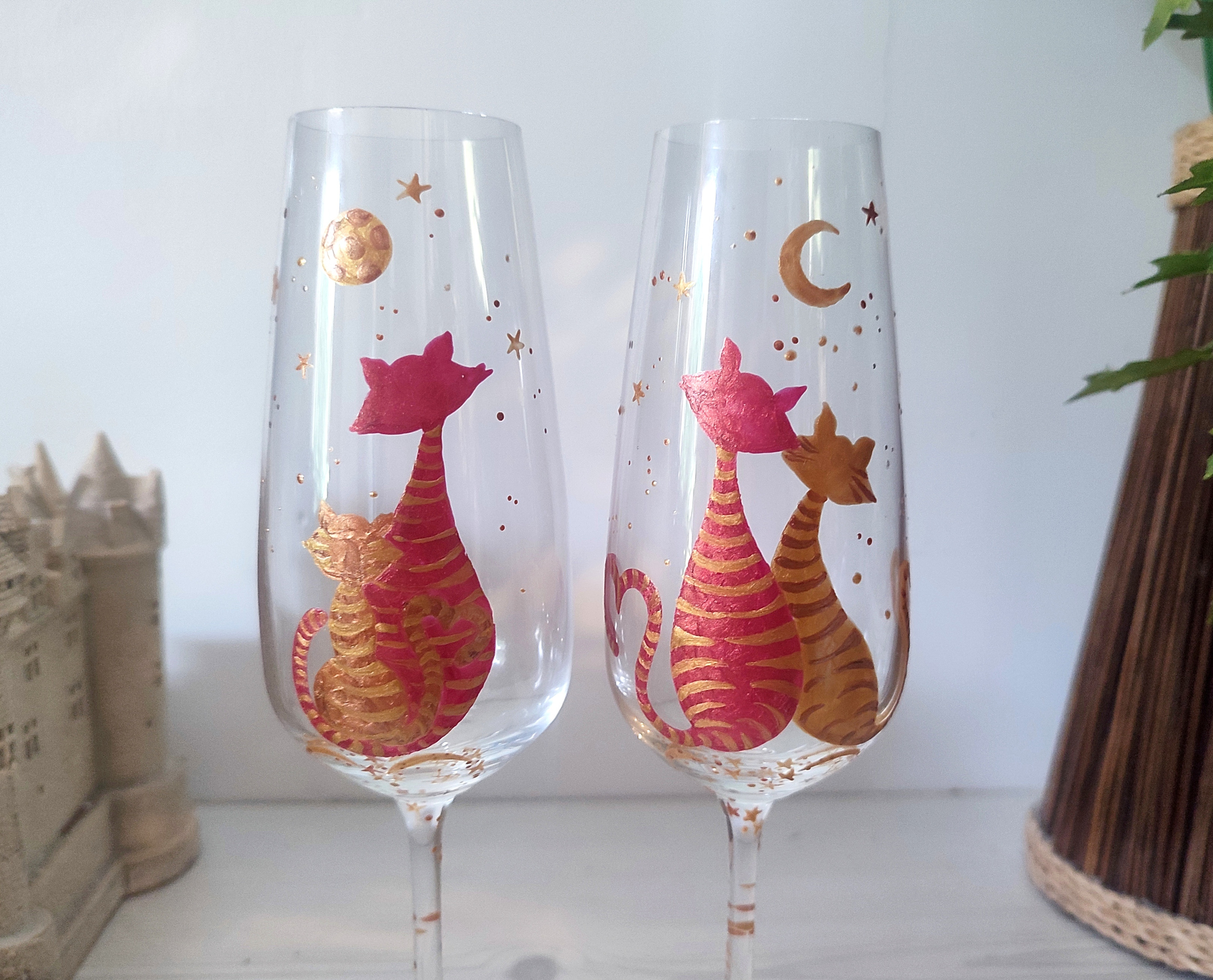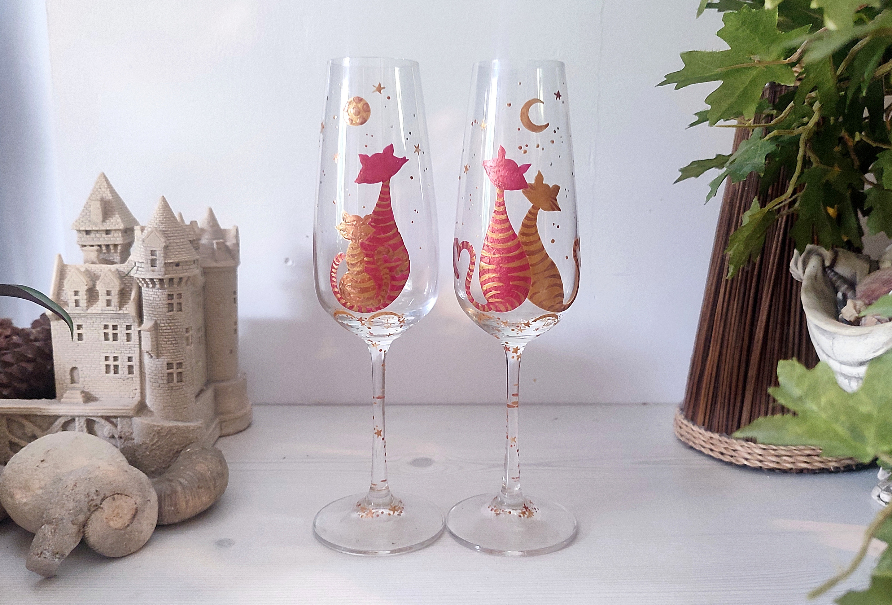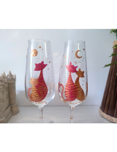 Ces verres sont en cristal de bohème sur le thème de nos amis les chats. Ces deux petits minous admirent un levé de lune sous le ciel étoilé.