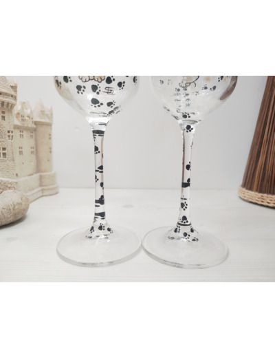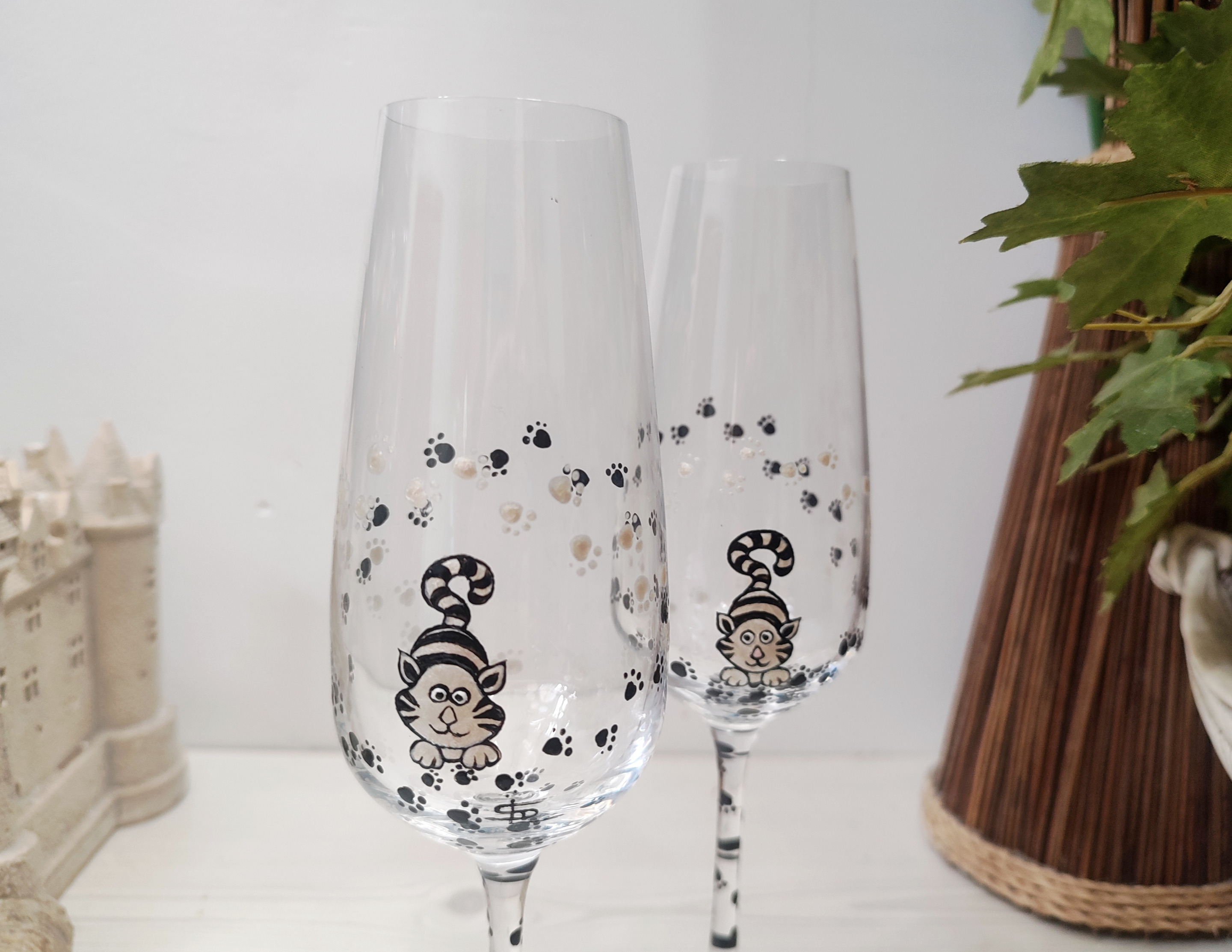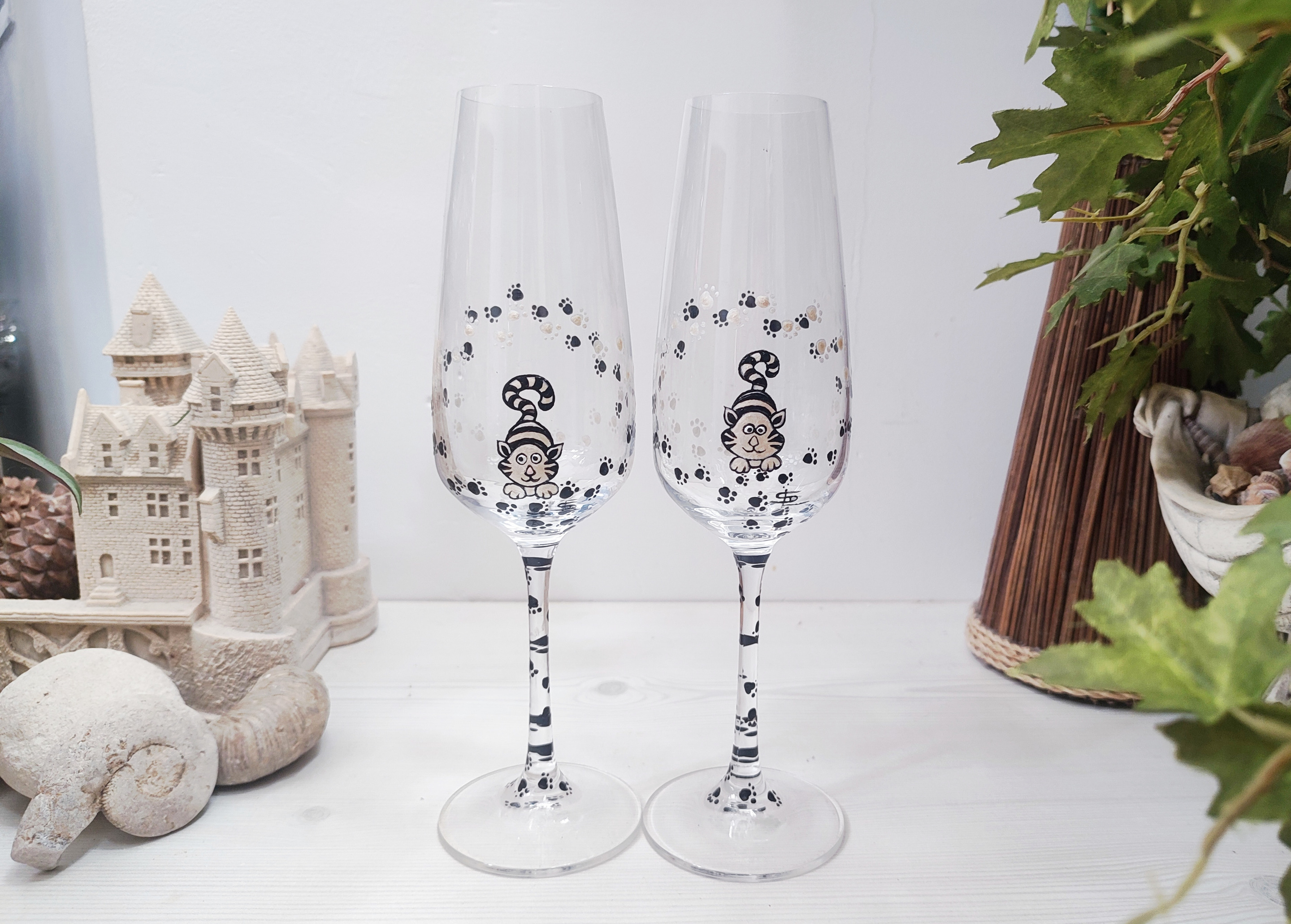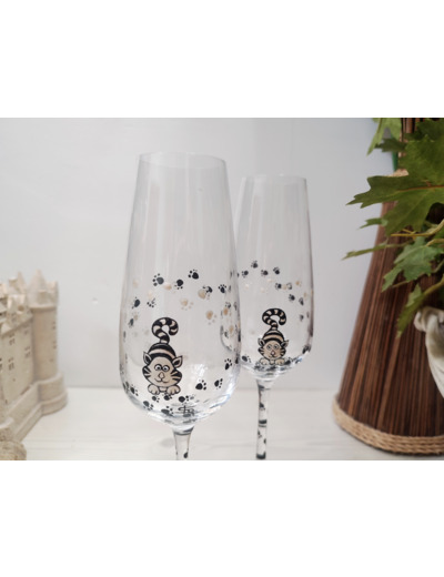 Duo de deux jolies flutes en cristal, dans les couleurs noires et blanches, entièrement peintes à la main sur le thème de nos amis les chats.