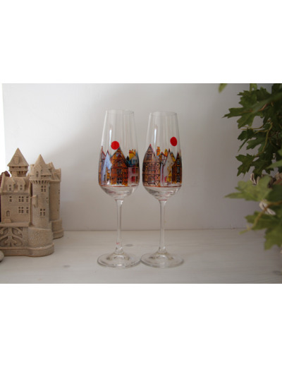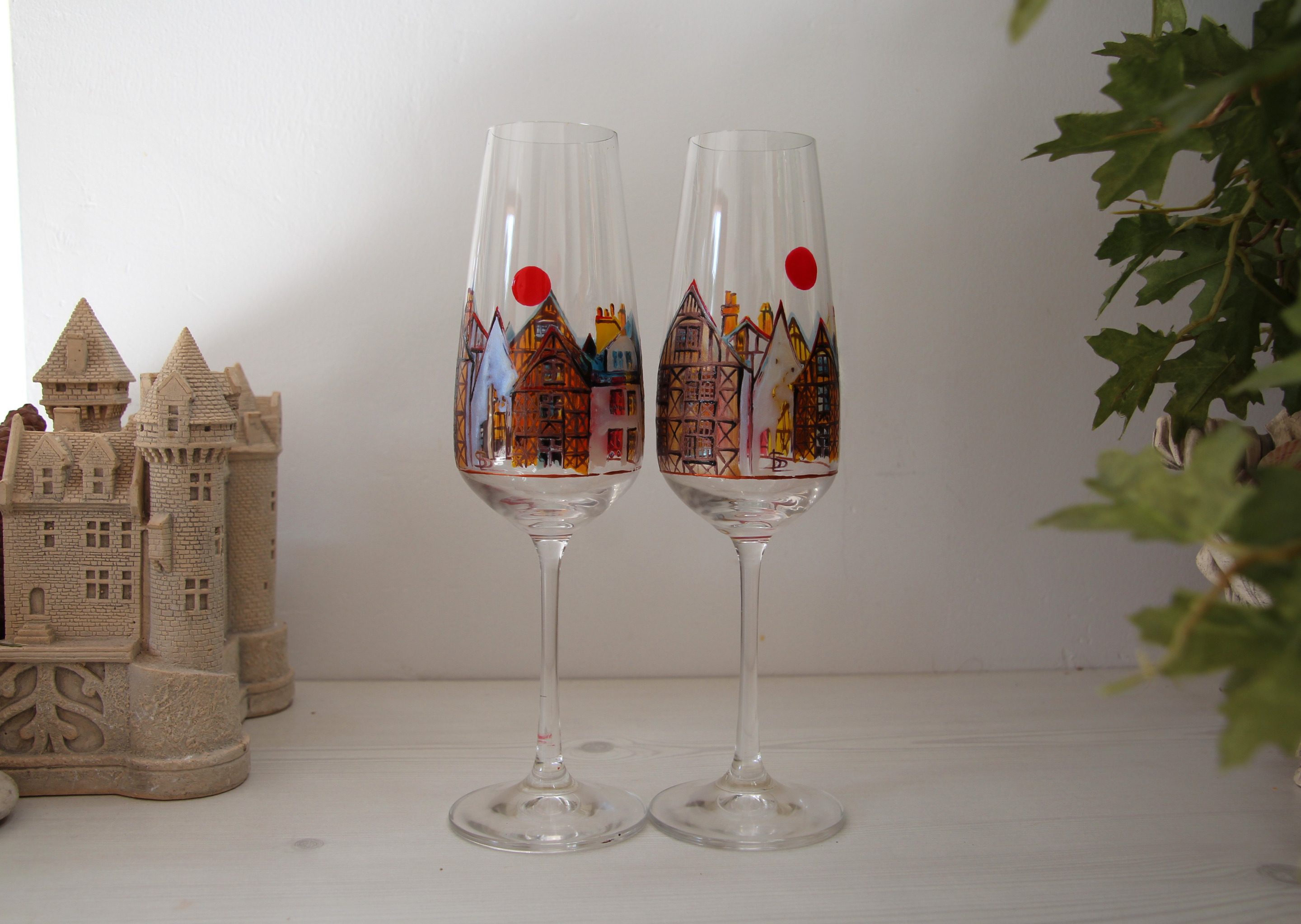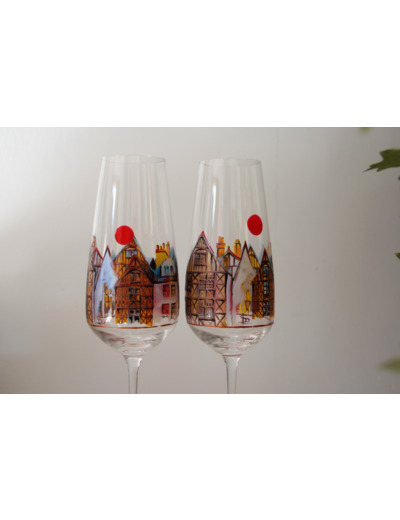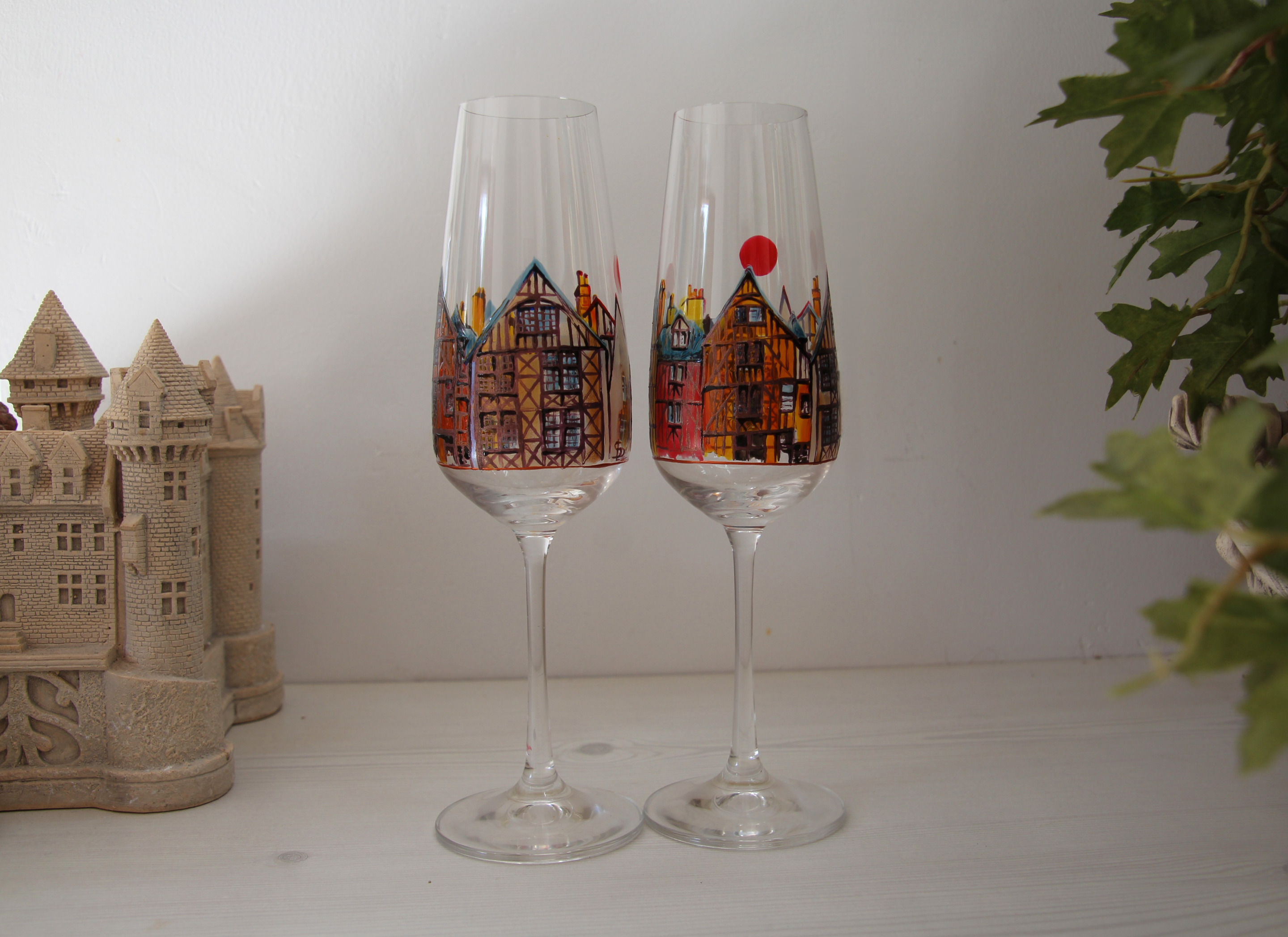 Ces jolies flûtes en cristallin représentant le quartier du vieux Tours ont été peintes à la main.