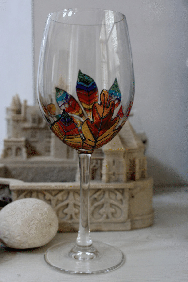 Grand Verre À Pied En Cristal De Toutes Les Couleurs Peint À La Main Sur Le Thème Des Feuilles Mortes Et De L'automne.