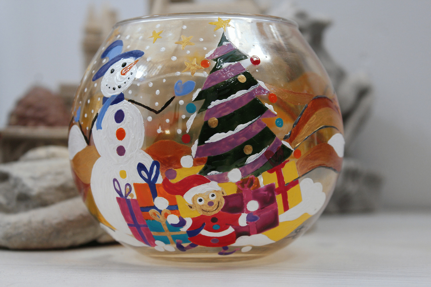 Joli Photophore Peint À La Main Sur Le Thème De Noël, Des Lutins, Bonhomme De Neige, Pièce Unique Très Colorée - Bougie Flottante -