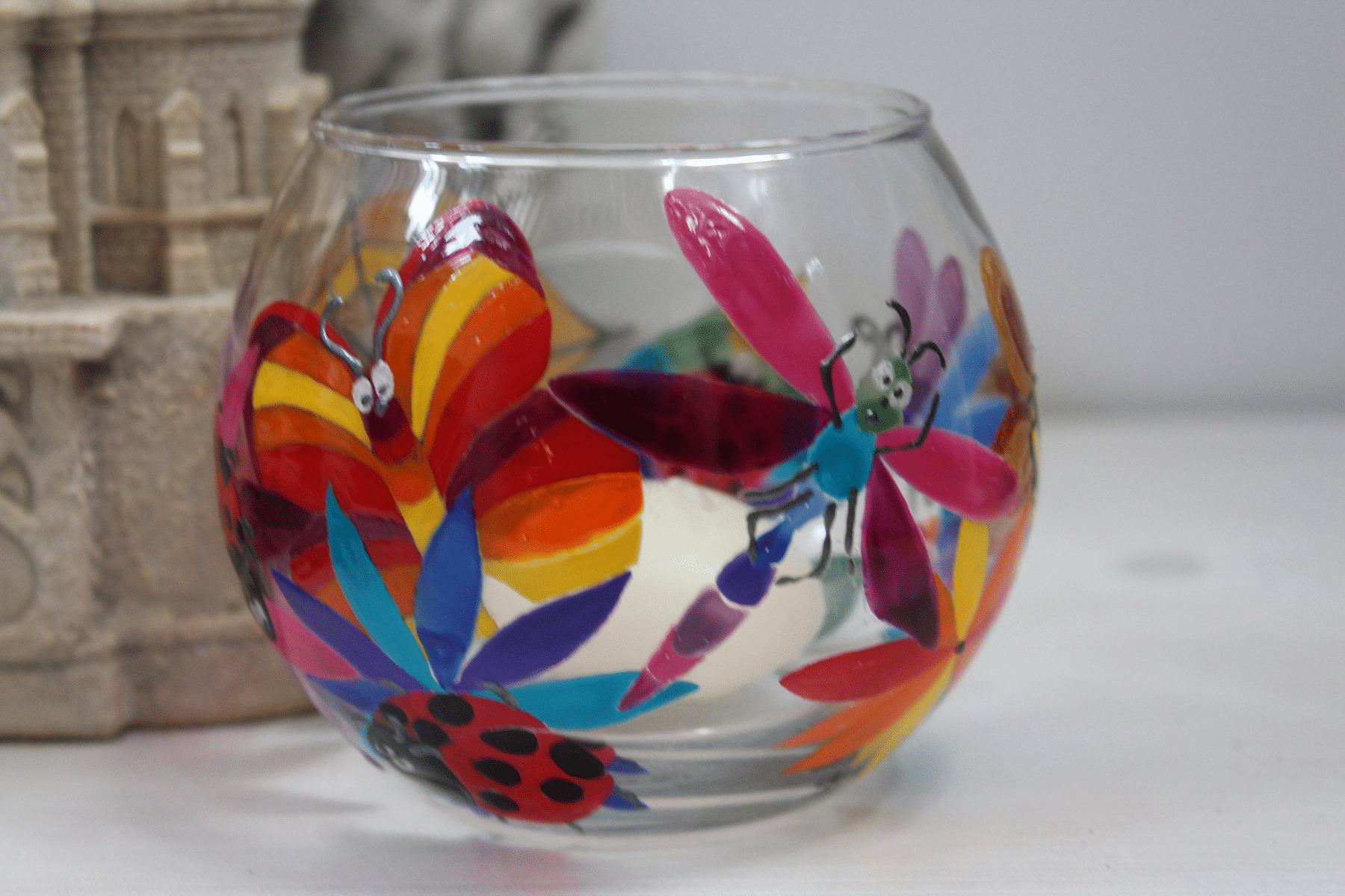 Joli Photophore Peint À La Main Sur Le Thème Des Papillons Des Libellules Et Coccinelle Peinture Sur Verre Unique Très Colorée