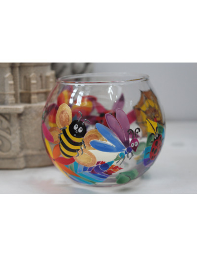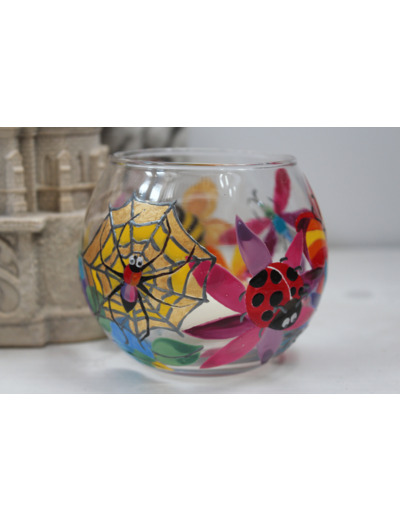 Joli photophore peint à la main, coccinelles, libellules, bourdons, papillons et même araignées sympathiques, se promènent sur les parois du photophore . Cet objet a été cuit au four pour une meilleure tenue.